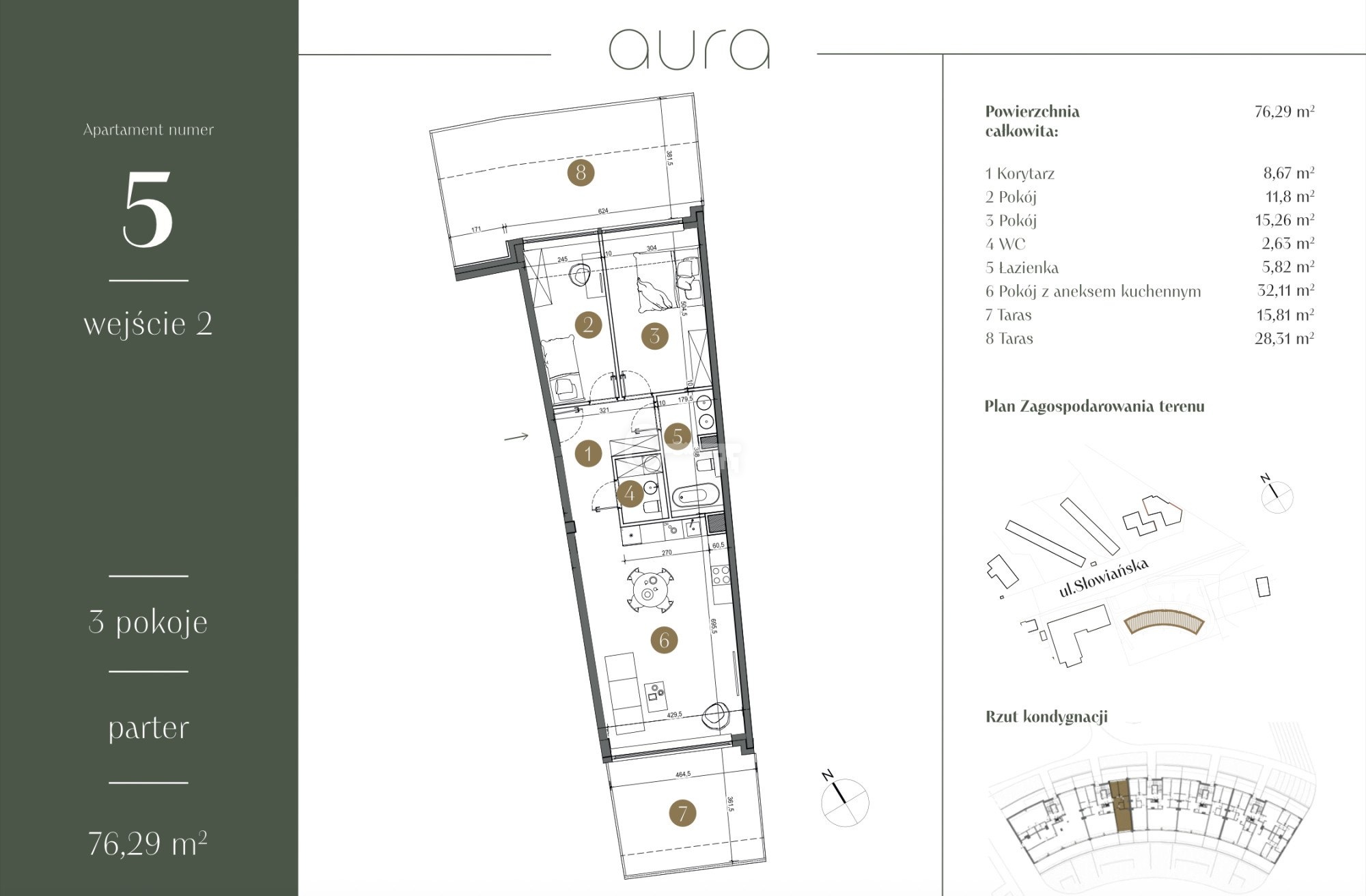 Prezentujemy Apartament nr 5 w prestiżowej inwestycji Aura przy ul. Słowiańskiej w Poznaniu – projekcie autorstwa Roberta Koniecznego (KWK Promes). To wyjątkowe mieszkanie o powierzchni 76,29 m², zlokalizowane na parterze, łączy komfort, nowoczesny design i kontakt z naturą. Dzięki przemyślanemu układowi, dużym przeszkleniom i dwóm tarasom (północ/południe) apartament jest pełen naturalnego światła i zapewnia wypoczynek w słońcu lub w cieniu.