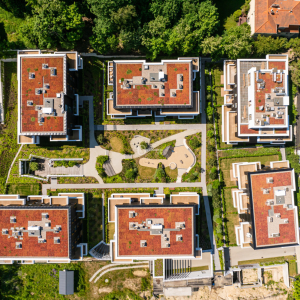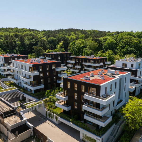 Kameralna, oddana do użytku inwestycja złożona z 6 budynków, wtulona w Trójmiejski Park Krajobrazowy. Elewacje pokryte są drzewem palonym metodą shou sugi ban, rzadko spotykaną w europejskim kontekście kulturowym. To bardzo szlachetna, naturalna technika konserwująca drewno, pochodząca z Japonii.