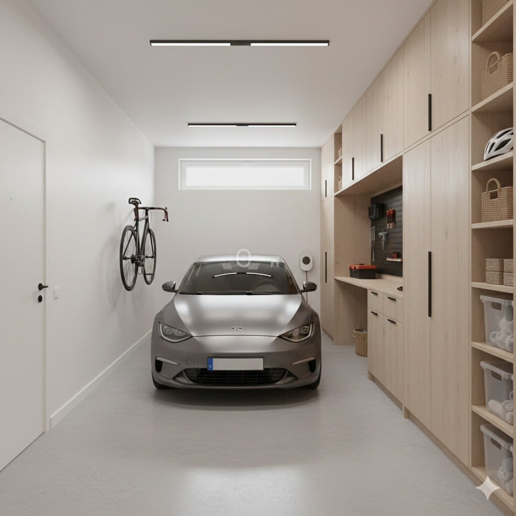 * garaż w bryle budynku,