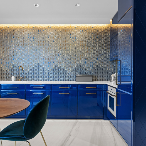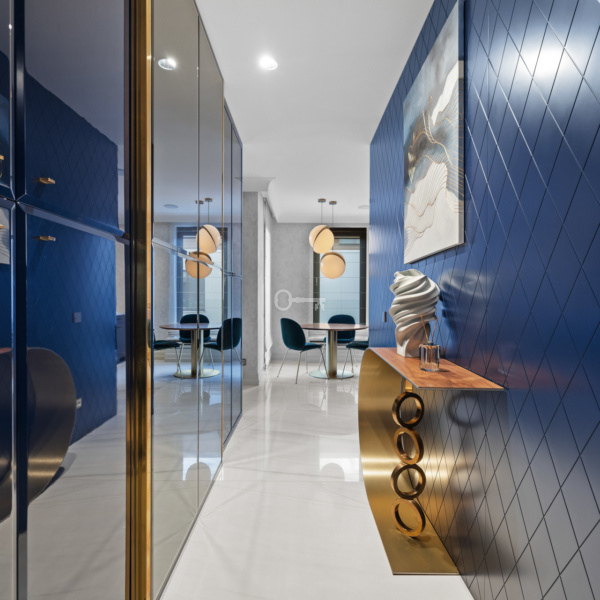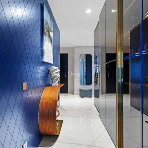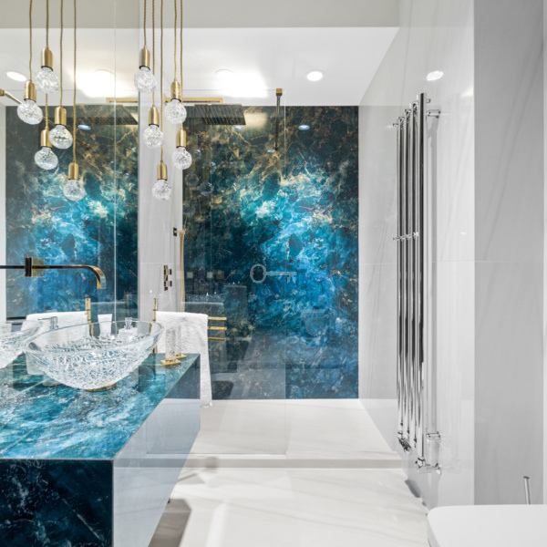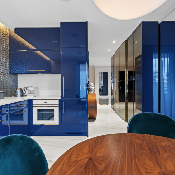 Apartament został wykończony przy użyciu najwyższej jakości materiałów. Nowoczesny i w pełni funkcjonalny projekt architektoniczny daje poczucie dużej przestrzeni i komfortu. W nieruchomości została położona drewniana podłoga – orzech amerykański, a ściany zostały udekorowane podświetlonym onyksem. Meble ruchome to cenione marki światowych projektantów. Finalnie dodatkowo przyszły lokator będzie miał do swojej dyspozycji system inteligentnego domu (basalte smart home) oraz klimatyzację.