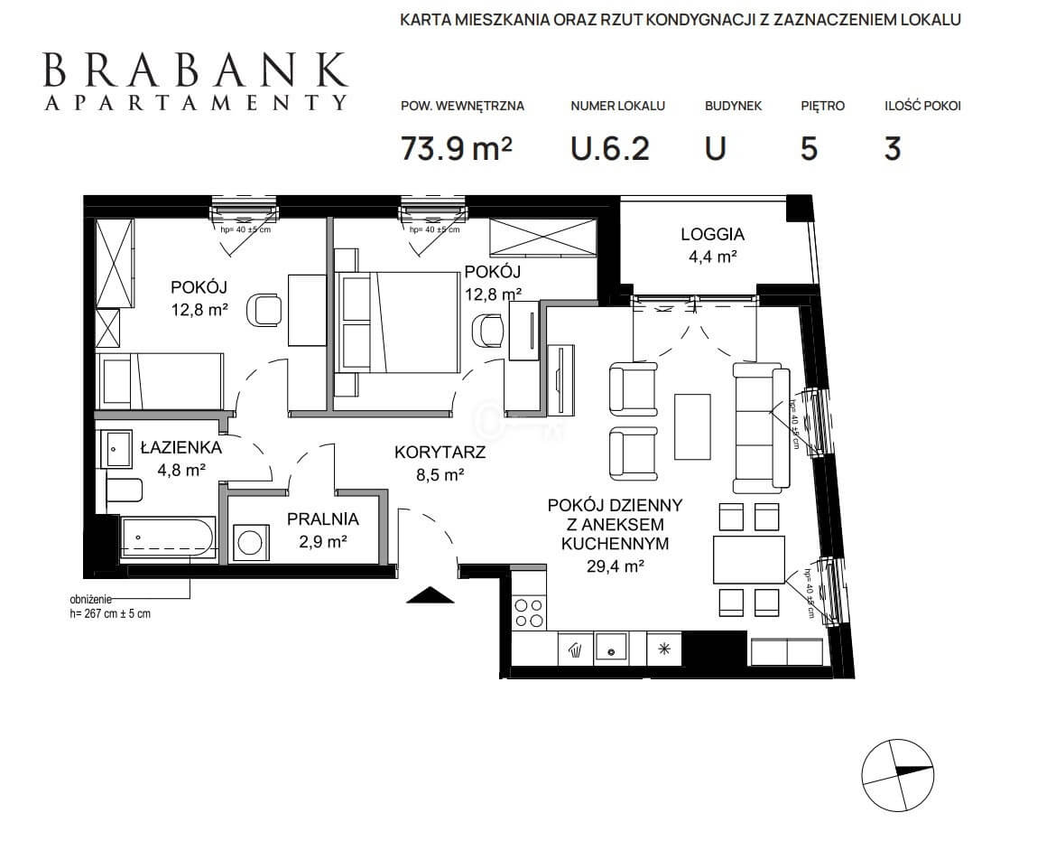 Apartament jest w stanie deweloperskim dzięki czemu można go dopasować całkowicie do własnych potrzeb. Standard inwestycji Brabank to wyjątkowej klasy format wyjątkowej architektury, płynnie łączący szacunek do historii z architektonicznym kunsztem. Inwestycja była nagradzana w międzynarodowych konkursach: „Best Residential Development Poland”. Elegancka paleta barw, wysublimowane połączenie odcieni i szlachetnego mosiądzu w połączeniu z białym włoskim marmurem w częściach wspólnych podkreśli wysoką klasę inwestycji.