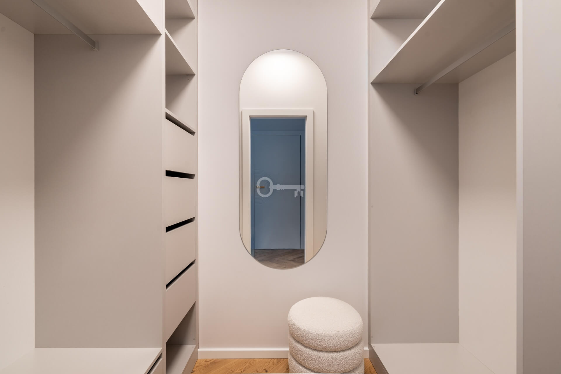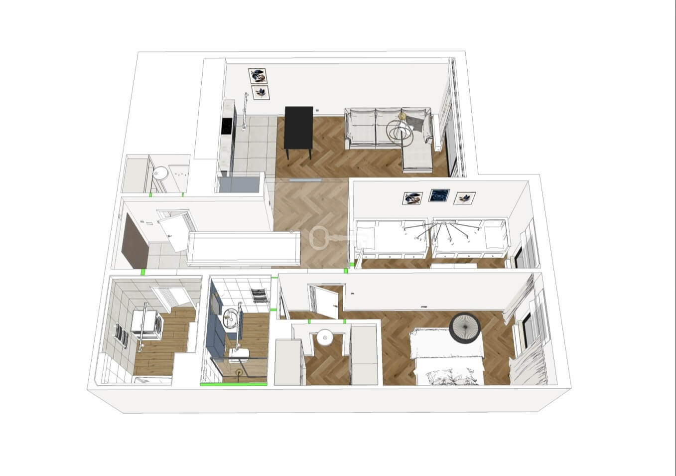 Apartament o powierzchni 83,82 m² charakteryzuje się funkcjonalnym podziałem na część dzienną i prywatną: