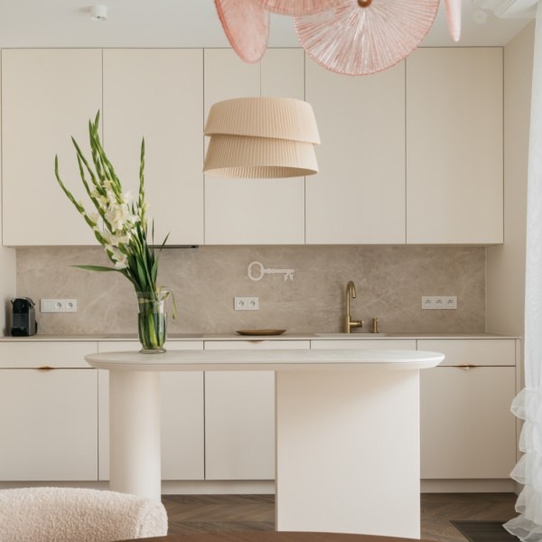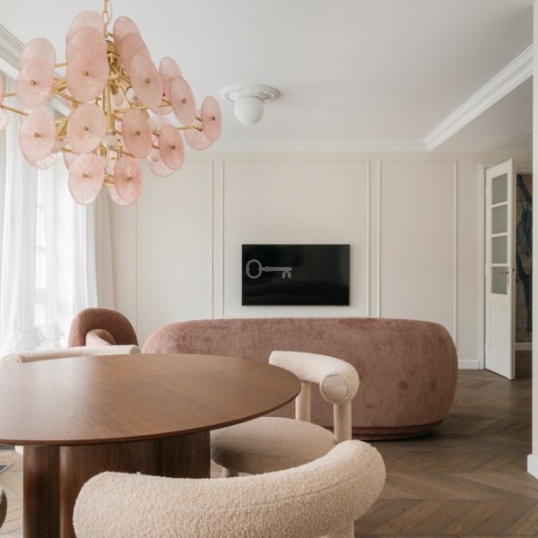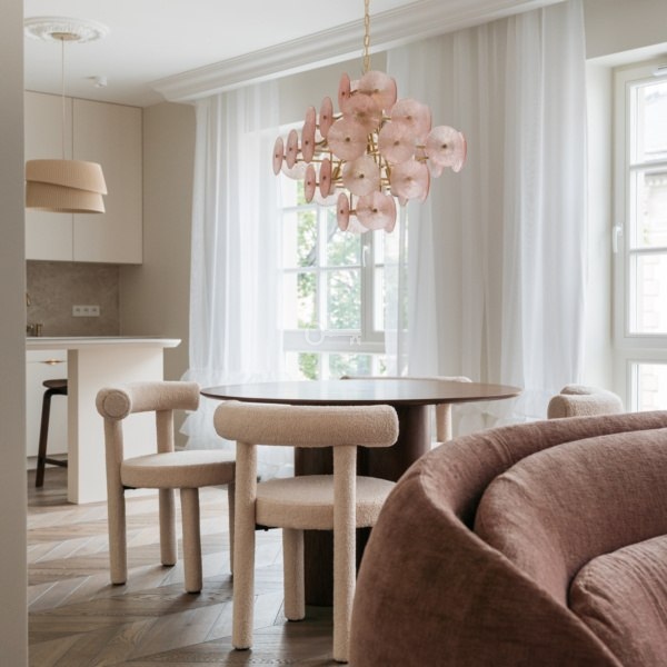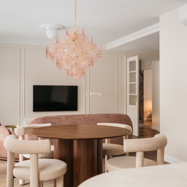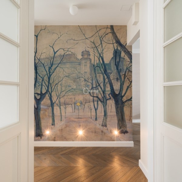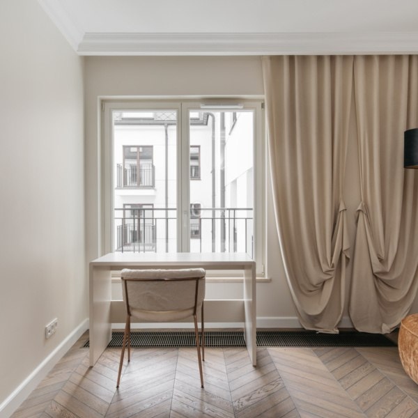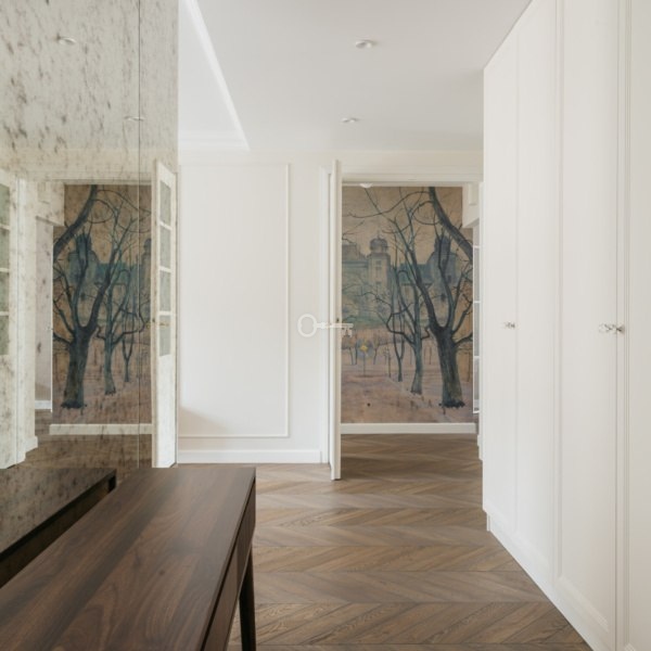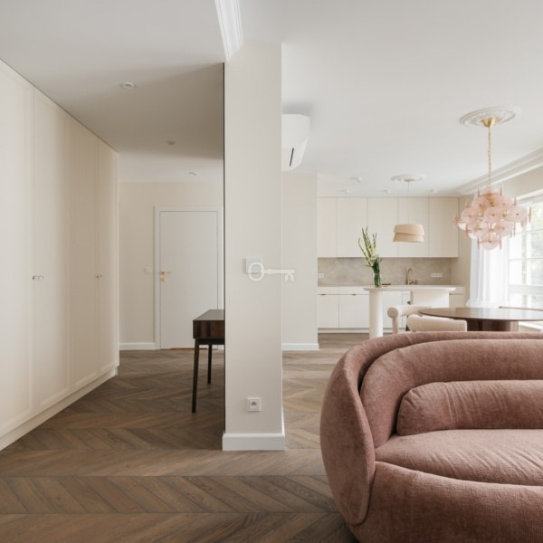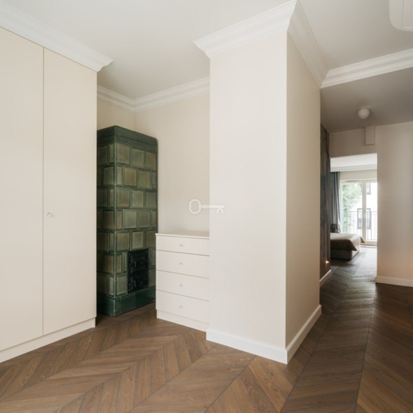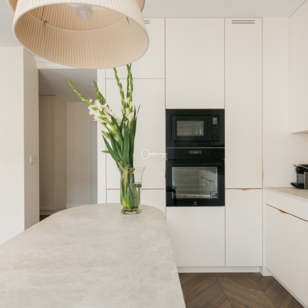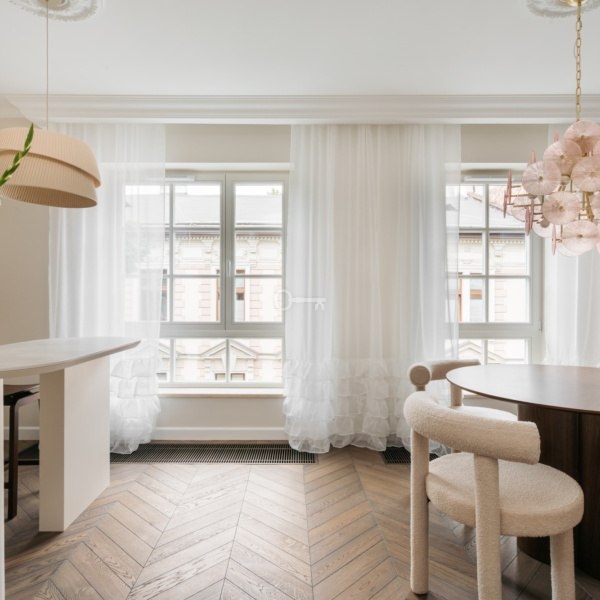 Apartament został zaprojektowany i wykończony w najwyższym standardzie. Włoskie meble robione na zamówienie podkreślają prestiż wnętrz. Kryształy Swarovskiego i skandynawski żyrandol dodają elegancji i blasku. Klepka dębowa na podłodze nadaje całości ponadczasowego charakteru.