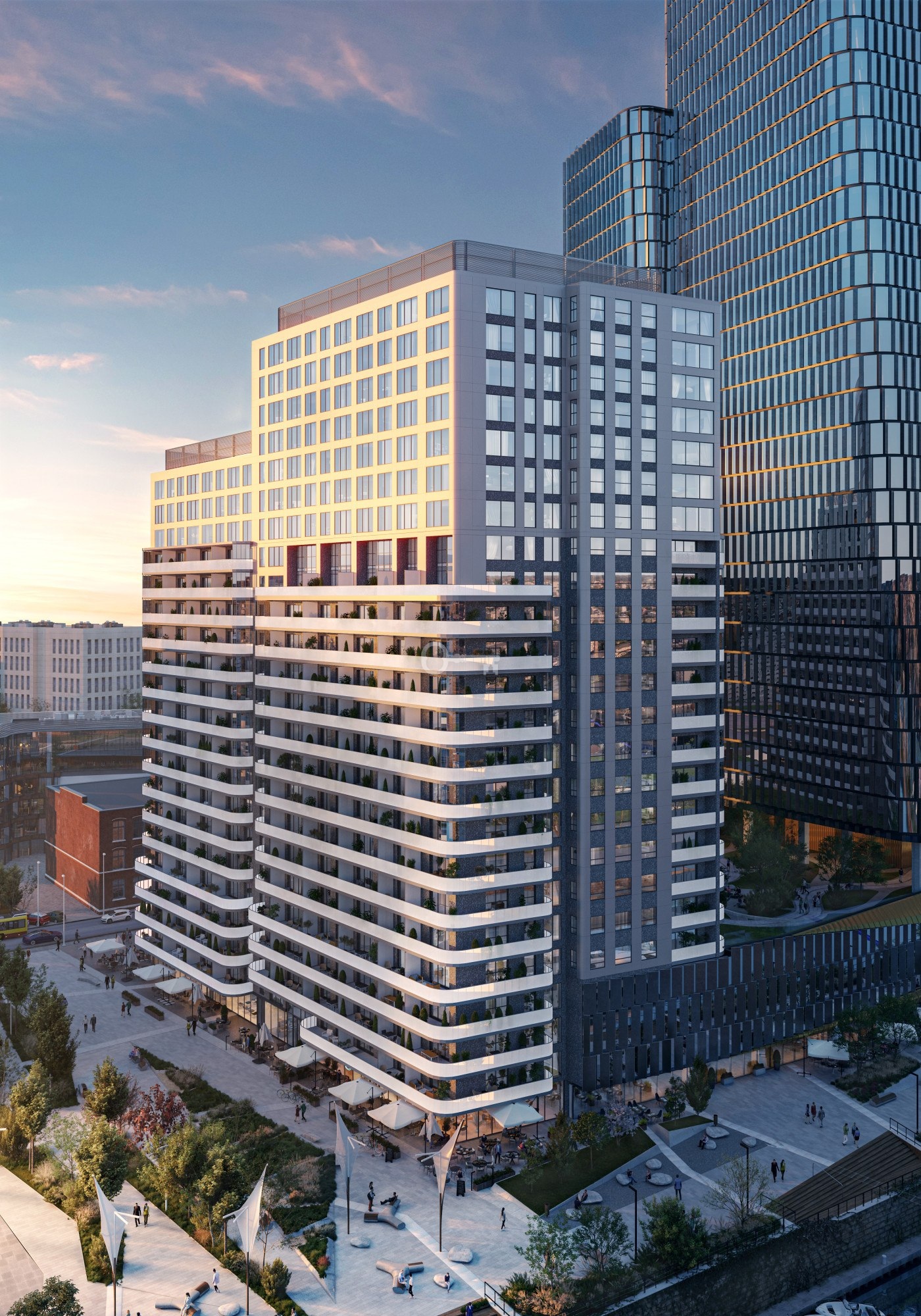 Kompleks wielofunkcyjny łączący mieszkania, biura i przestrzenie rekreacyjne. Tarasy i zielone strefy dostępne dla mieszkańców Lokale usługowe na parterze Ogólnodostępny deptak i tereny zielone przy budynku Garaż podziemny i komórki lokatorskie Reprezentacyjne lobby i przestrzenie wspólne