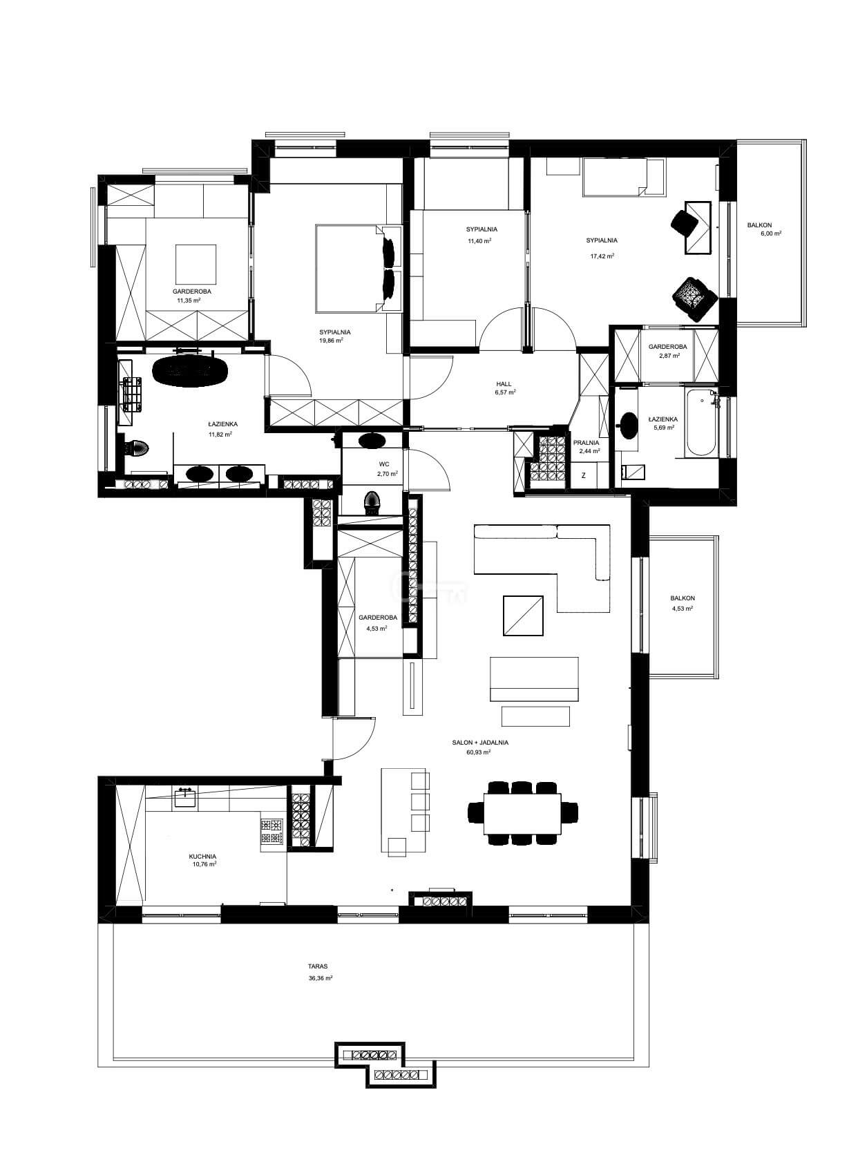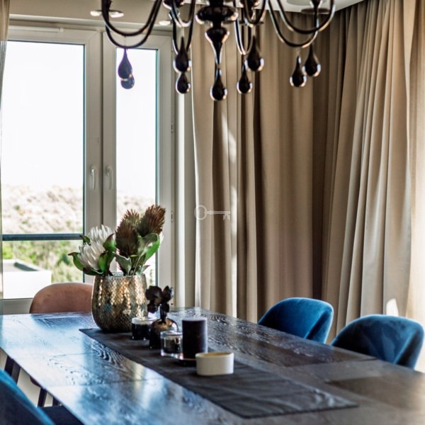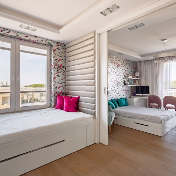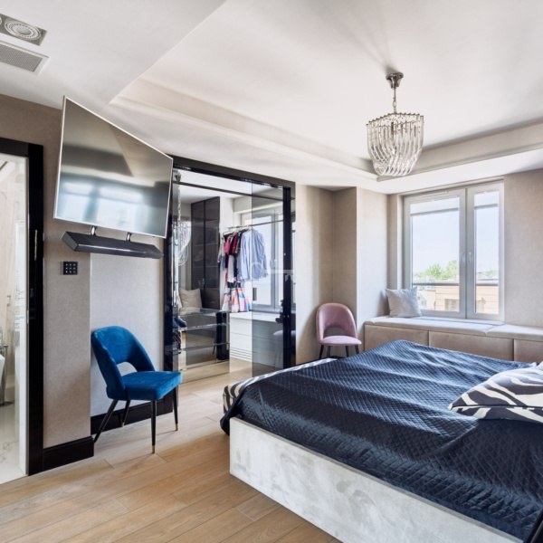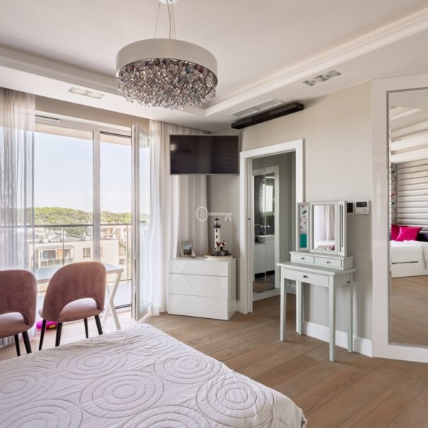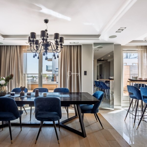 Ekskluzywny apartament, wykończony z użyciem najwyższej jakości materiałów, harmonijnie łączący komfort z luksusem. Mieszkanie oferuje trzy przestronne sypialnie, każda z indywidualną łazienką i garderobą, co zapewnia maksymalną prywatność. Salon z jadalnią to doskonała przestrzeń zarówno do wypoczynku, jak i spotkań towarzyskich. Kuchnia jest wyposażona w sprzęt najwyższej klasy, co czyni ją wyjątkowo funkcjonalną. Podłogi wykonano na zamówienie z naturalnego drewna, a zaawansowany system smart home marki Ampio oferuje pełną automatyzację i wygodę.