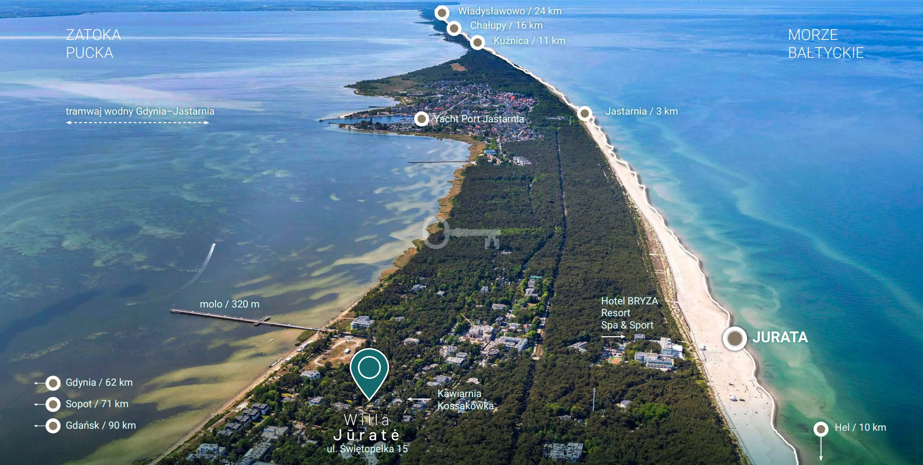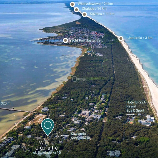 Willa zlokalizowana jest w sercu Juraty, przy ul. Świętopełka 15 – w otoczeniu sosnowego lasu, zaledwie kilka minut spacerem od plaży i molo. Jurata to prestiżowa miejscowość wypoczynkowa na Półwyspie Helskim, oferująca spokój, naturę i doskonałą infrastrukturę. W pobliżu znajdują się restauracje, kawiarnie, ścieżki rowerowe.