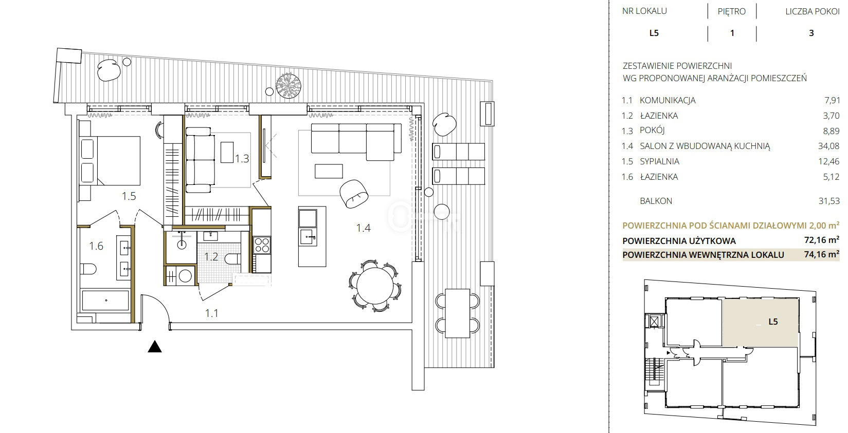 Dodatkowym atutem jest przestronny balkon o powierzchni 33,38 m², idealny do wypoczynku na świeżym powietrzu.