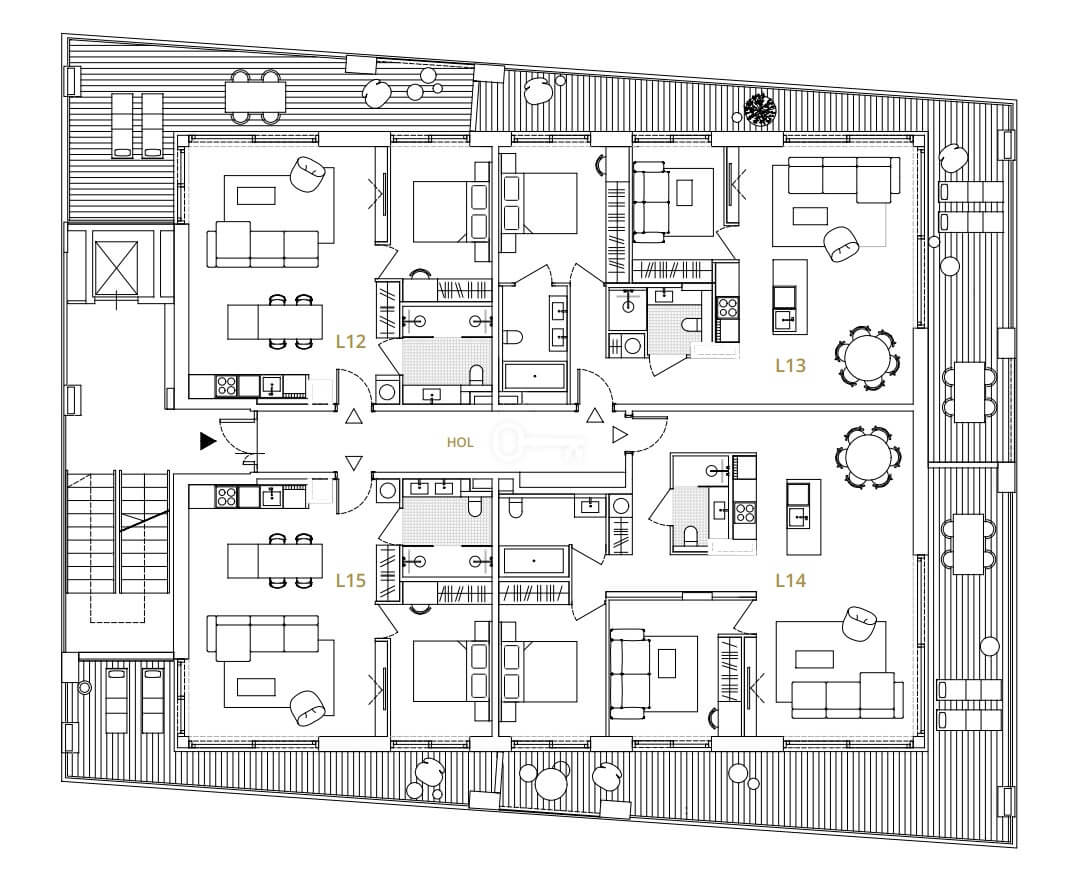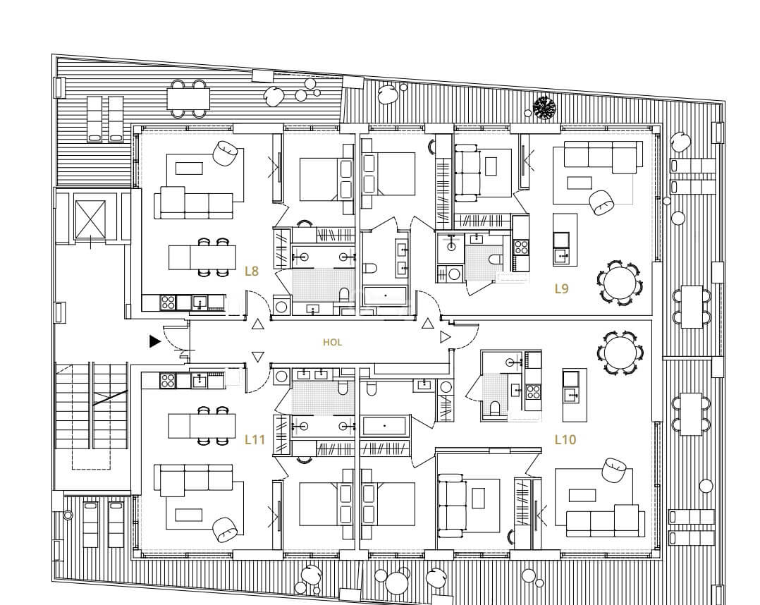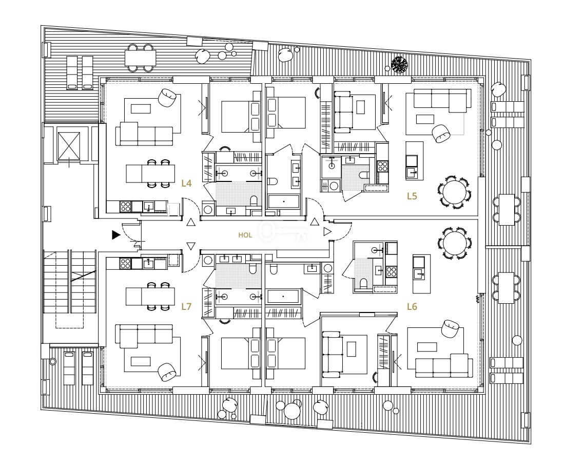 * Balkony wykończone w drewnie, z balustradami ze stali nierdzewnej.