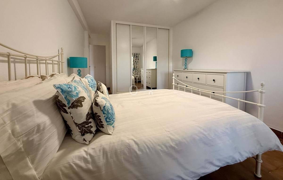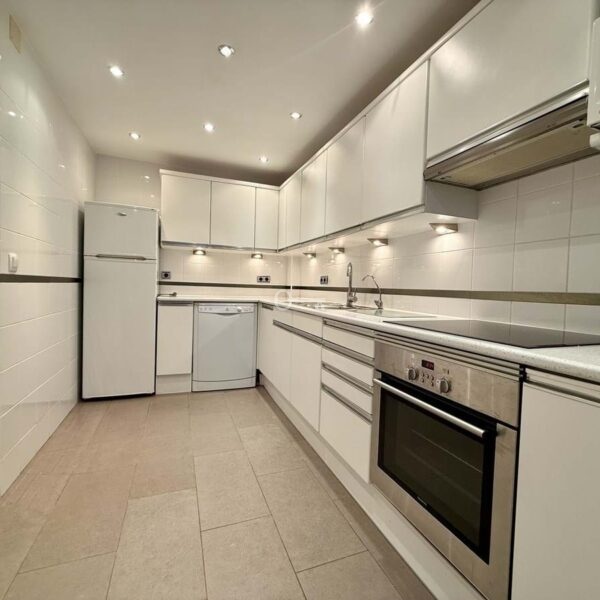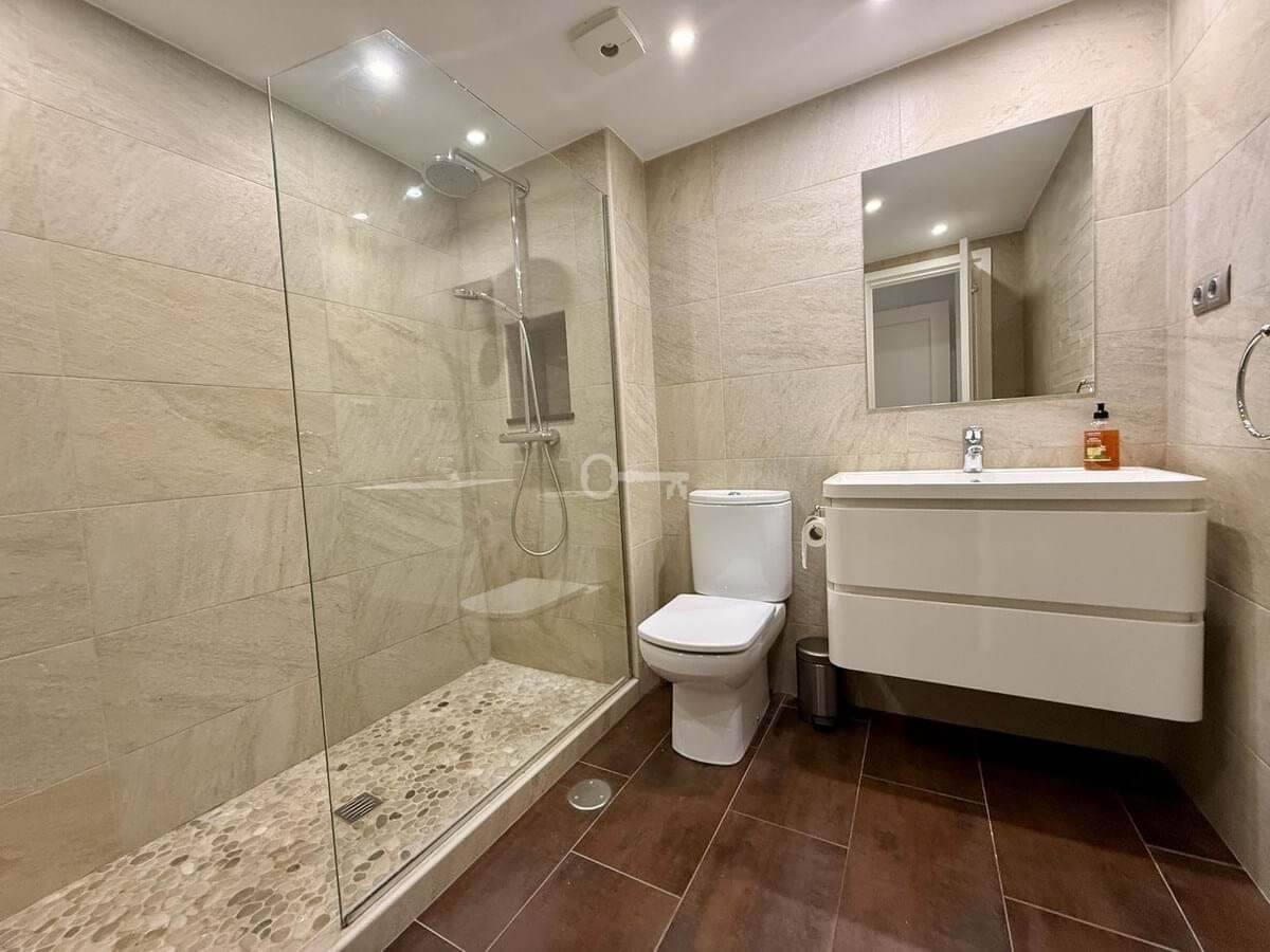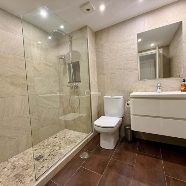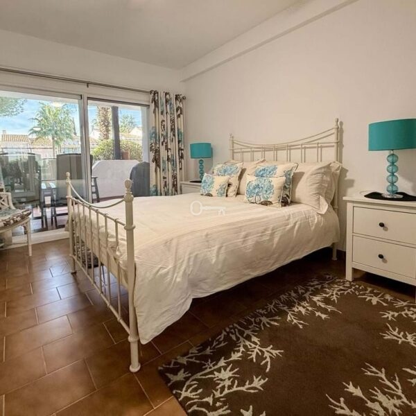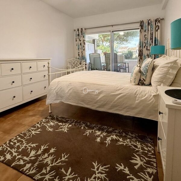The master bedroom enjoys direct access to the terrace and includes a generous en-suite bathroom with double vanity. The second bedroom is equally well-proportioned and is served by its own separate bathroom. Additional features include marble flooring, full air conditioning and heating, videophone entry system, and electric shutters. The property also benefits from convenient access to covered parking with ample available spaces.