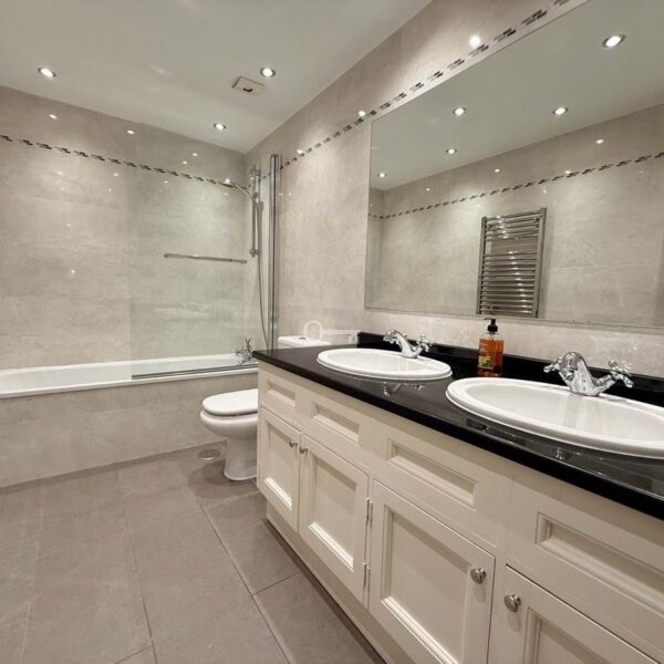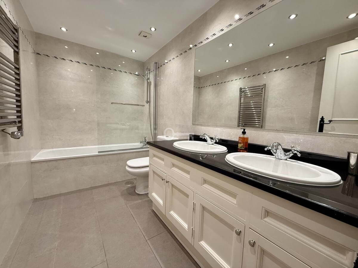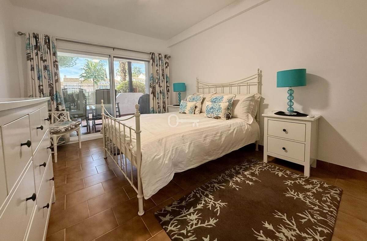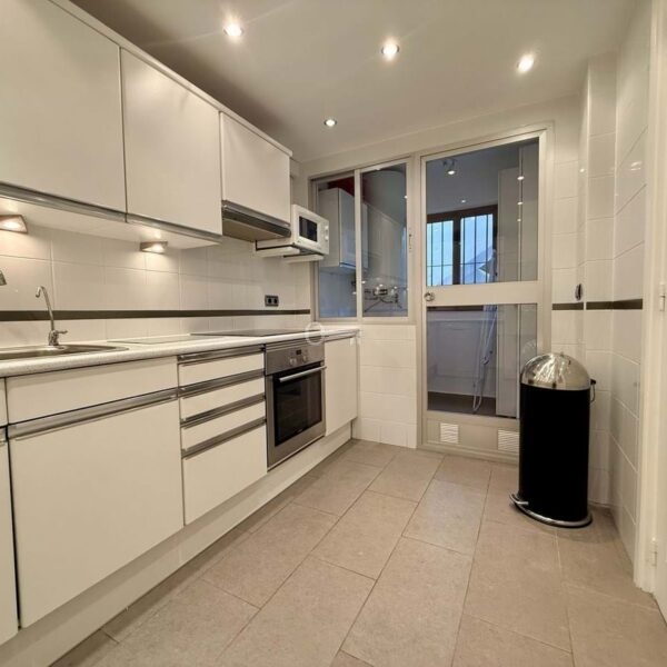 The master bedroom enjoys direct access to the terrace and includes a generous en-suite bathroom with double vanity. The second bedroom is equally well-proportioned and is served by its own separate bathroom. Additional features include marble flooring, full air conditioning and heating, videophone entry system, and electric shutters. The property also benefits from convenient access to covered parking with ample available spaces.