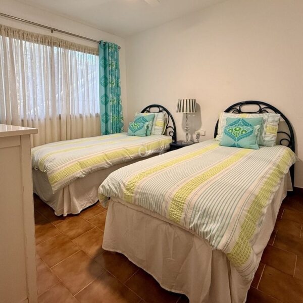 The apartment features a spacious covered terrace that offers excellent privacy and lovely panoramic views over the palm-filled gardens, with the mountains as a picturesque backdrop.