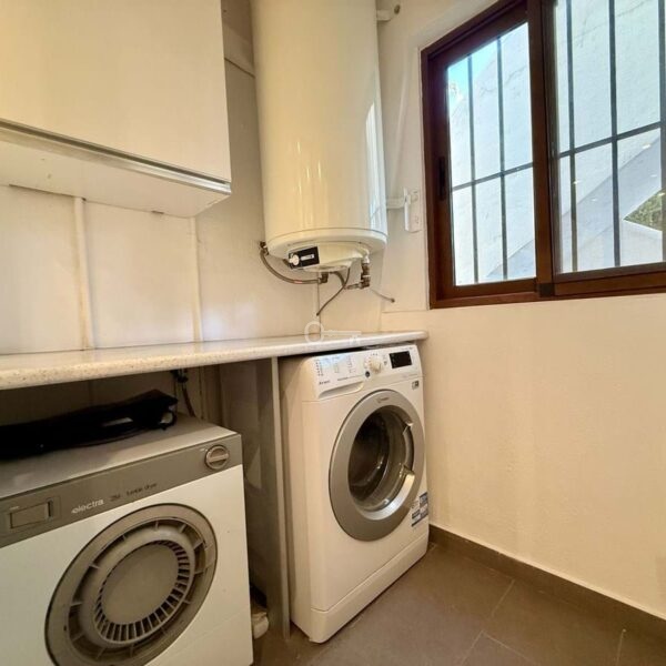 The interior comprises a welcoming entrance hall, a well-appointed kitchen fully equipped, and a separate utility room with washer and dryer. The kitchen conveniently adjacent to the open-plan living and dining area, which opens directly onto the main terraceperfect for outdoor dining, relaxing, and sunbathing.