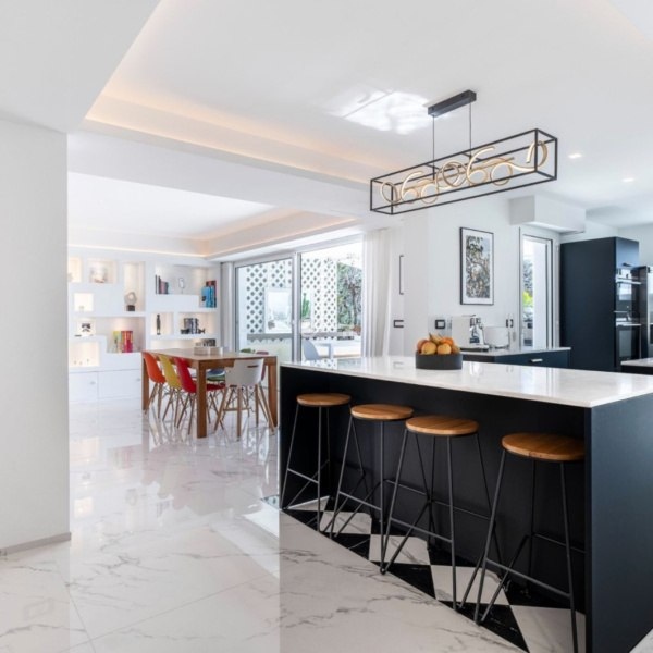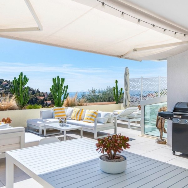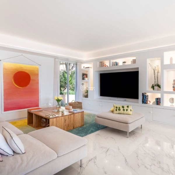 *Salon o powierzchni ponad 54 m², który płynnie łączy się z imponującym, 65-metrowym tarasem od strony południowej. Z tarasu rozpościera się zachwycający widok na morze, góry Esterel oraz Fort du Mont Alban.