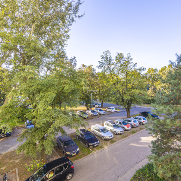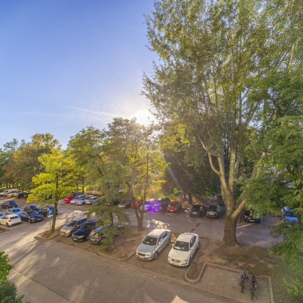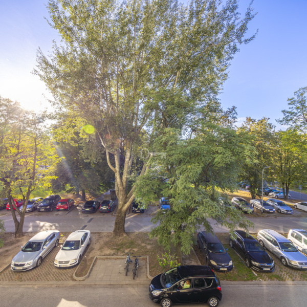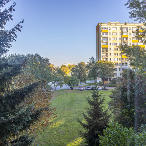Widok z pokoju dziennego oraz sypialni na drzewa. Orientacja mieszkania wschód – zachód.
