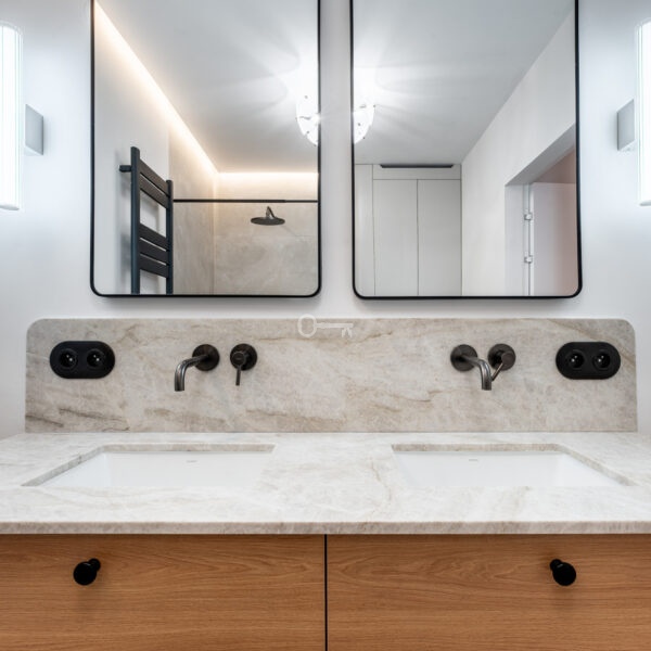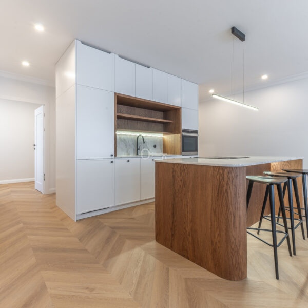 * kuchnię w zabudowie wykonaną z najwyższej jakości forniru i malowanego MDF, utrzymaną w minimalistycznej, ponadczasowej stylistyce,