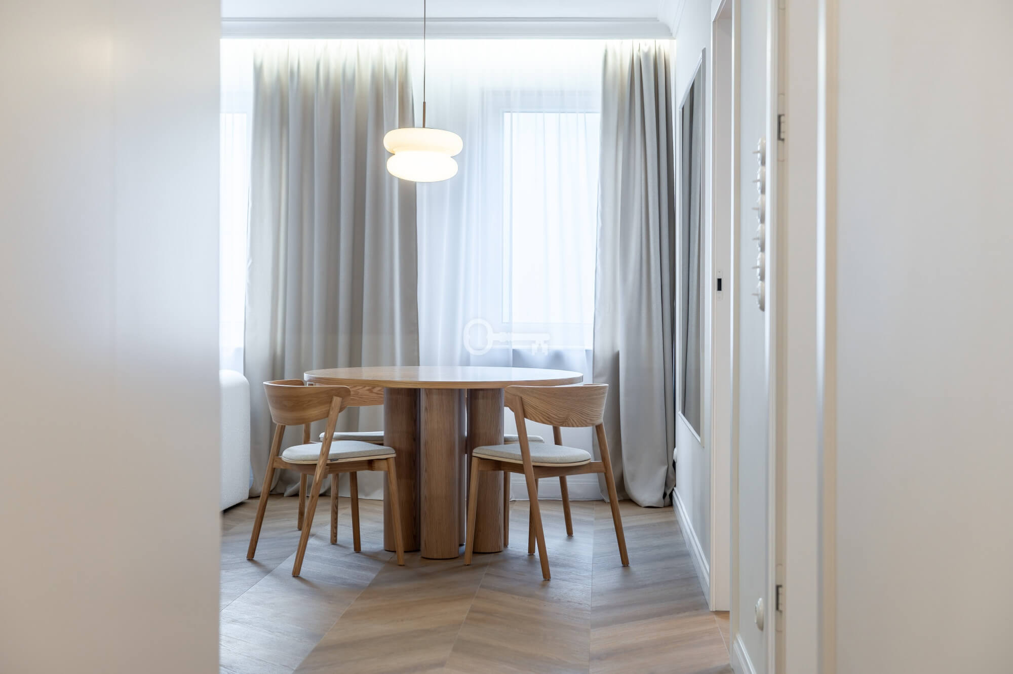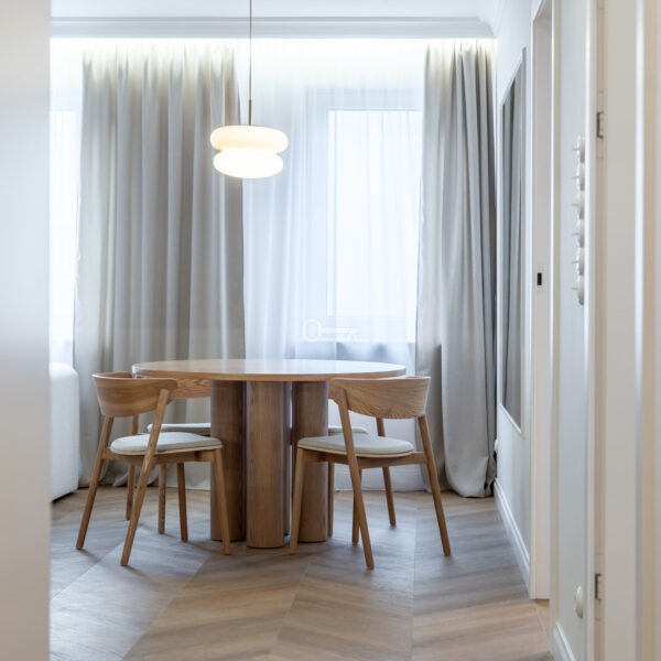 * strefę jadalnianą z drewnianym stołem i krzesłami renomowanych polskich producentów, tworzącą atmosferę przytulnego luksusu,