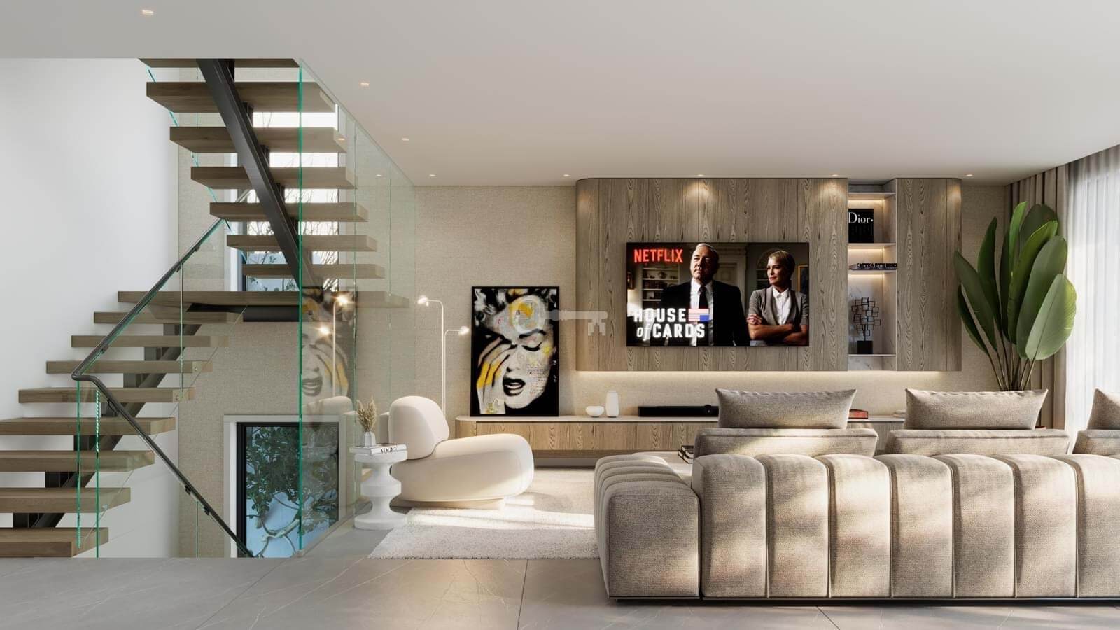 The property benefits from excellent natural light, underfloor heating on all levels (except the basement), built-in air conditioning, and a smart home system.