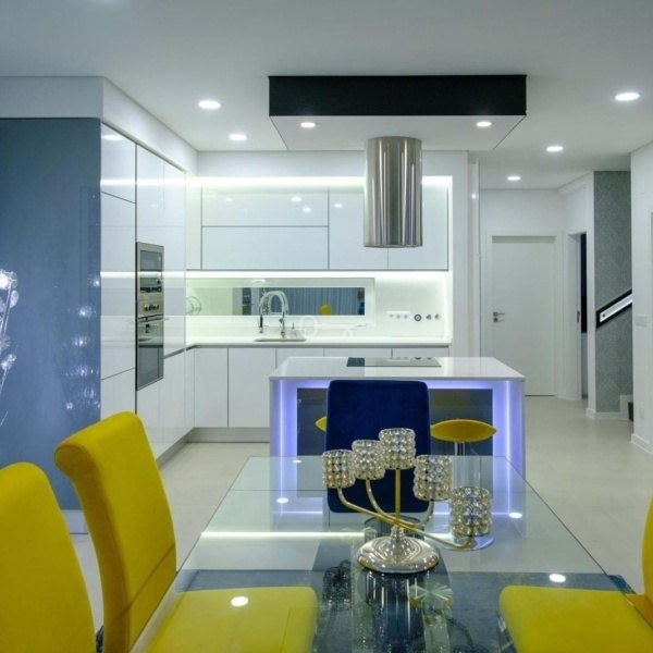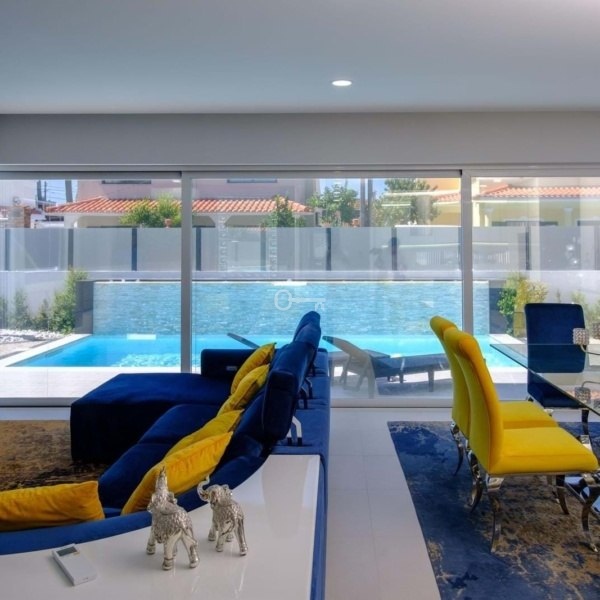 salon i kuchnia na otwartym planie z widokiem na basen