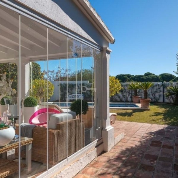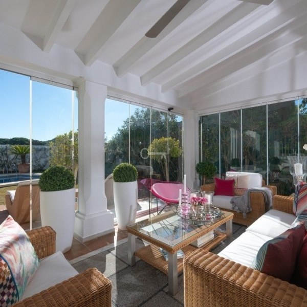 Przeszklony taras, płynnie łączący życie wewnątrz i na zewnątrz, pozwalający cieszyć się widokami przez cały rok, nawet w chłodniejsze dni.