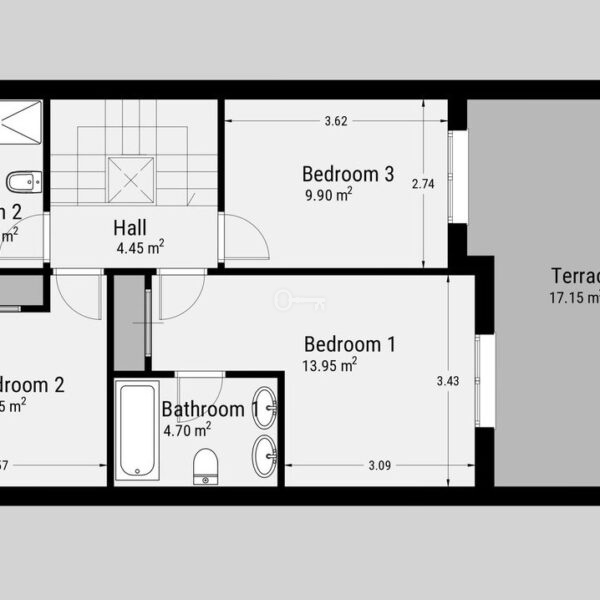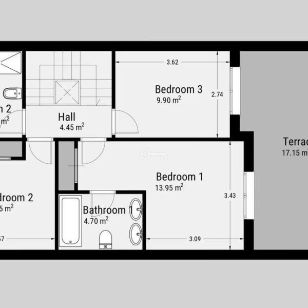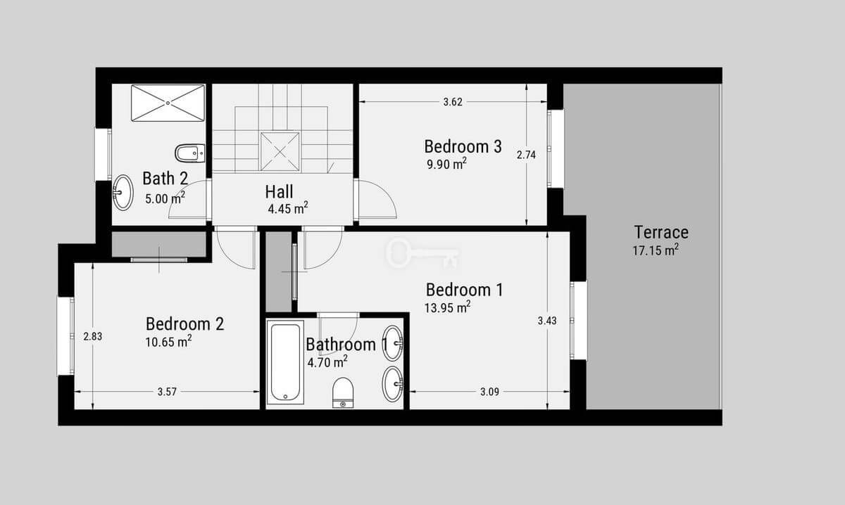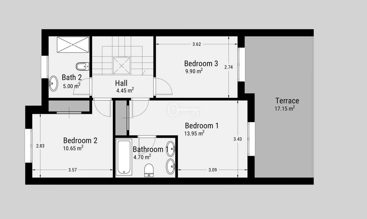 Na piętrze znajduje się główna sypialnia z łazienką, a także dwie dodatkowe sypialnie dla gości dzielące rodzinną łazienkę. Z dużego tarasu od strony południowej można podziwiać otwarte widoki na morze i słońce przez cały dzień.