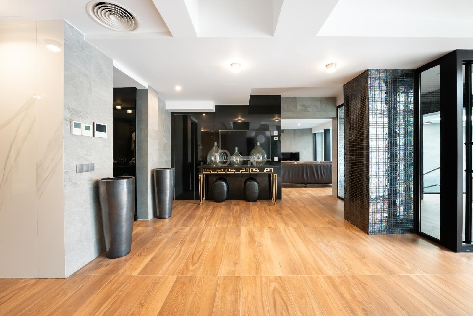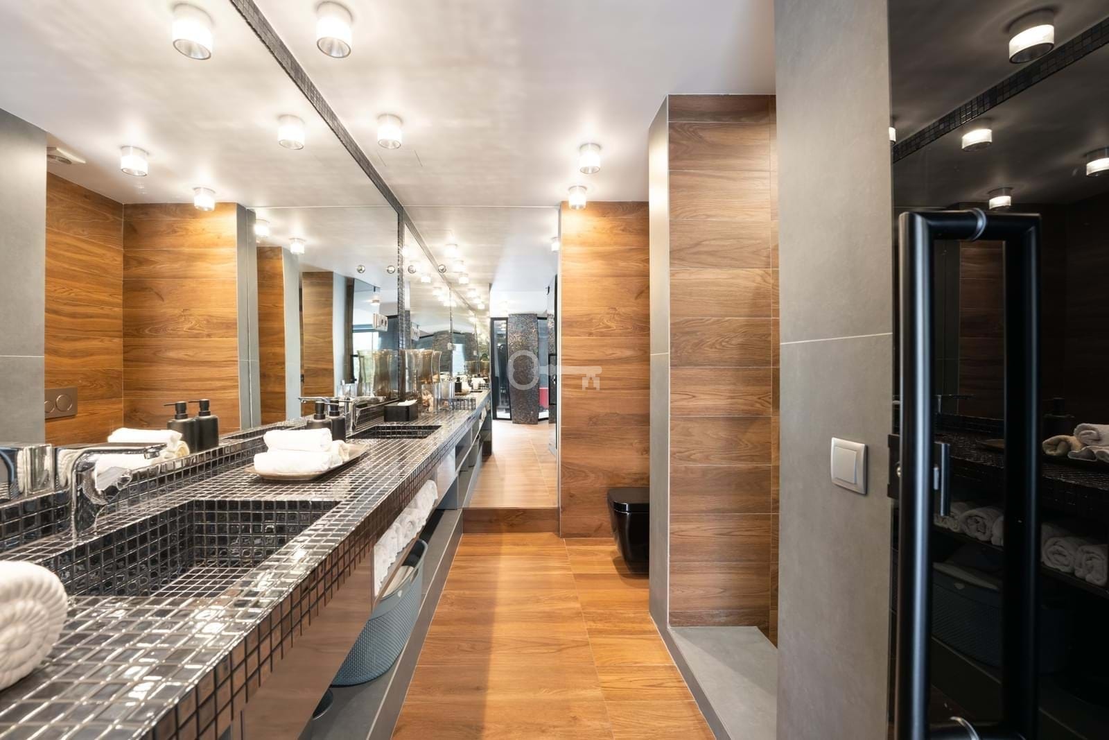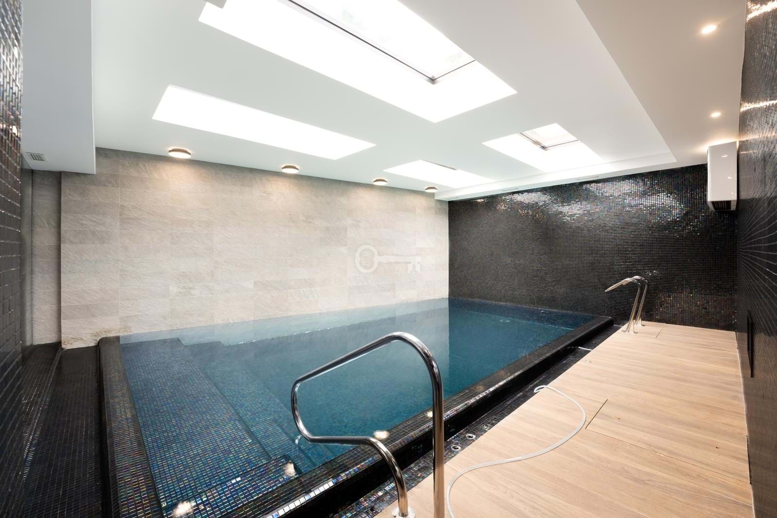 Parter: podgrzewany kryty basen z systemem osuszania, pomieszczenie pomocnicze z barem, czytelnia, biuro, apartament dla gości, pełna łazienka, pralnia, pomieszczenie techniczne i garaż na wiele pojazdów.