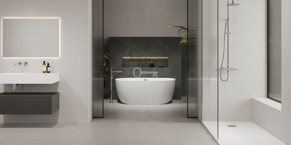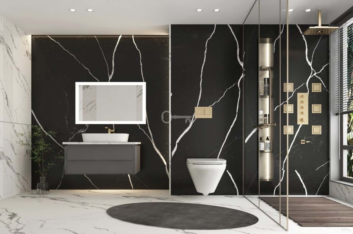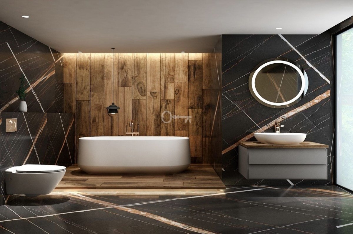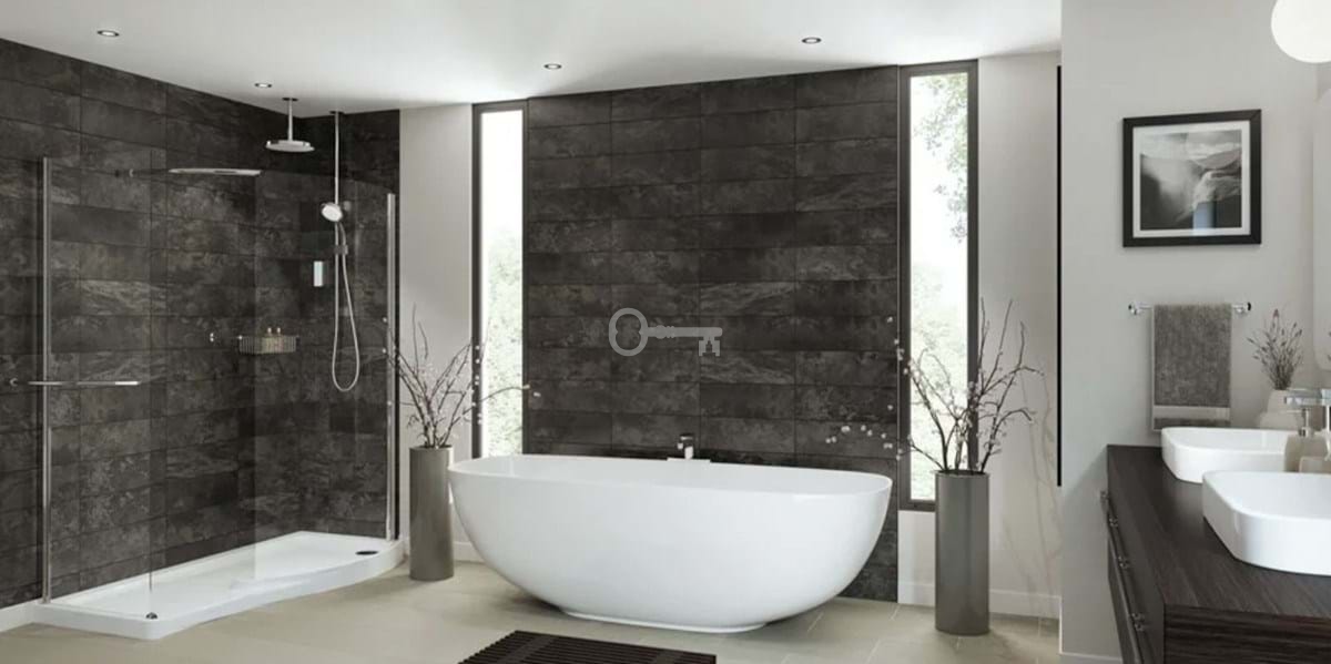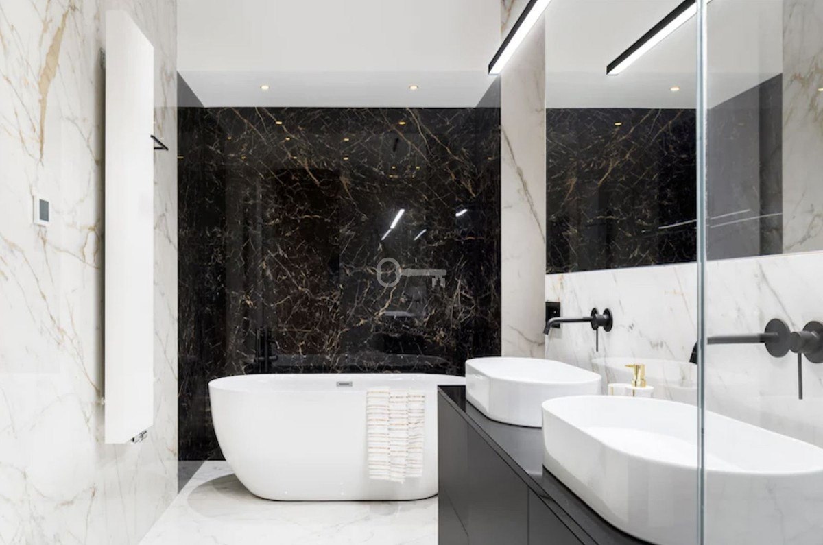 – Ściany łazienki z płytkami COVERLAM (GRESPANIA) 2700X1200