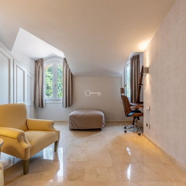 Na najwyższym piętrze tej mniejszej willi znajduje się główna sypialnia z ogromną łazienką, garderobą i pokojem relaksacyjnym.