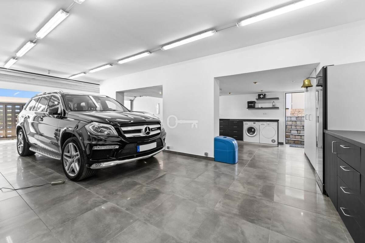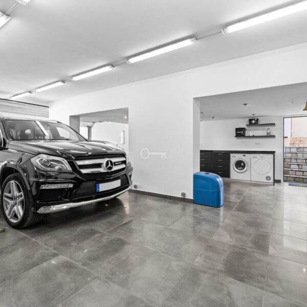 Na niższym poziomie znajduje się jasny, przestronny garaż na maksymalnie cztery pojazdy, służący również jako pomieszczenie gospodarcze z pralką i suszarką. Dzięki przemyślanej konstrukcji przestrzeń ta pozostaje sucha i chroniona nawet podczas ulewnych deszczy.