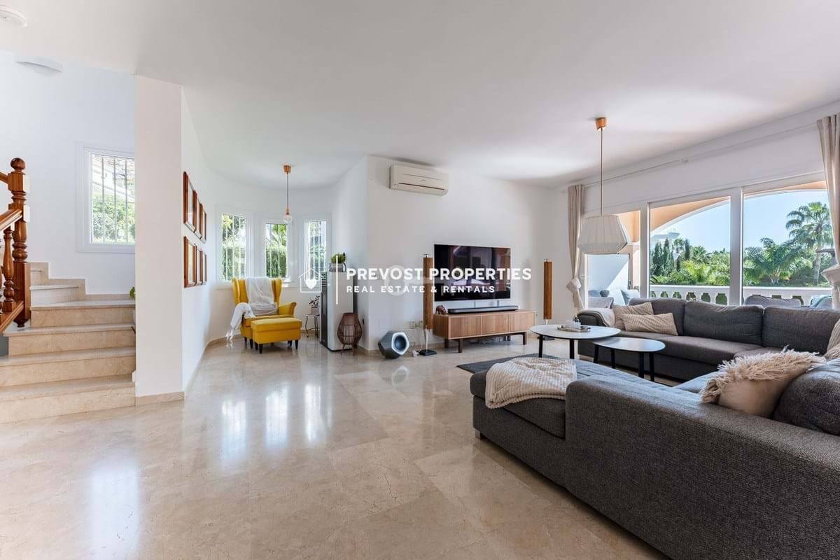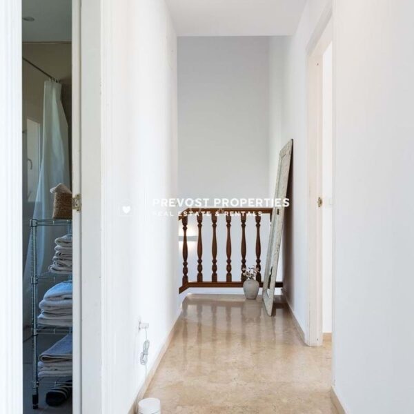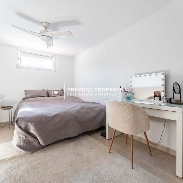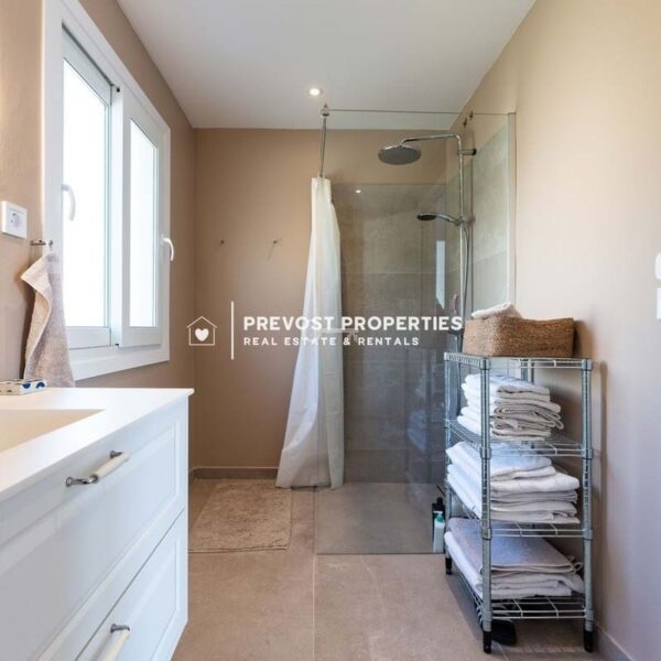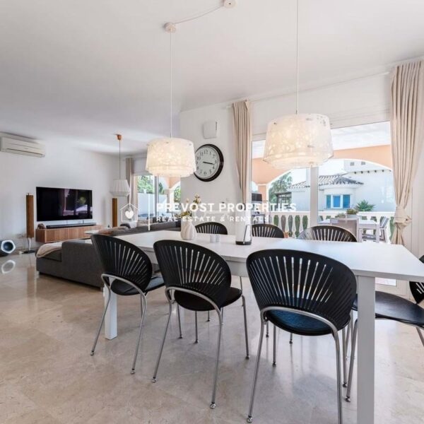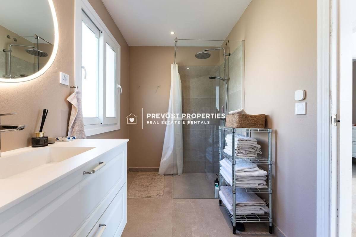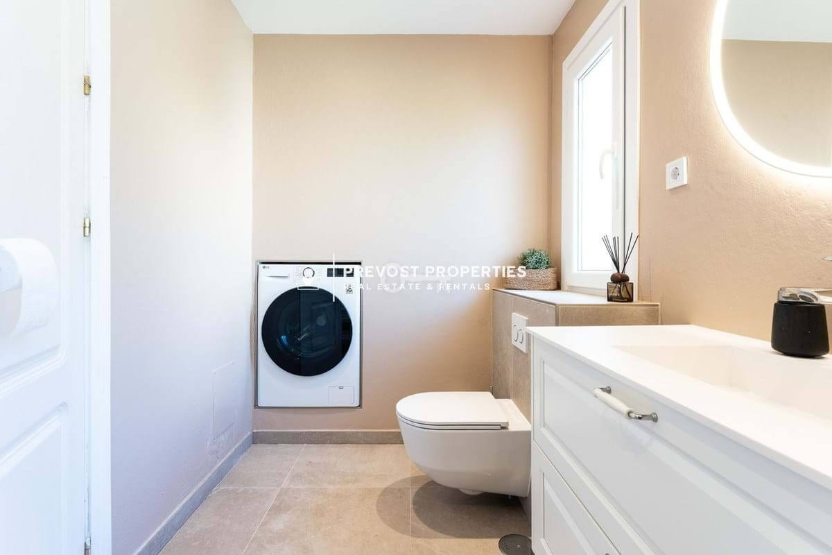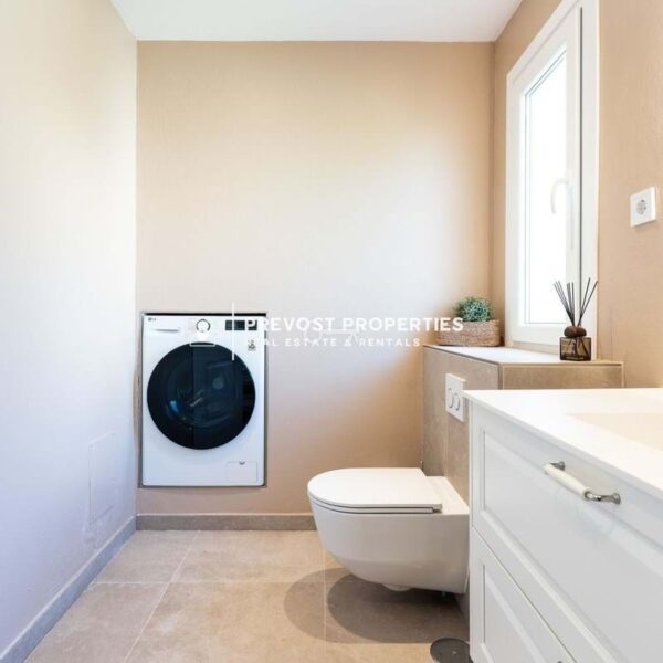 The Villa features a spacious open-plan living-dining room with a semi-open, modern, and fully functional kitchen, equipped with granite countertops, a Quooker tap, and Siemens appliances. The property also has a drinking water filtration system, allowing for drinking water directly from the house.