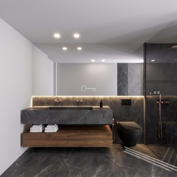 *łazienki wykończone naturalnym kamieniem (Pietra Gray, Lioz) z podwieszaną armaturą i wbudowanym oświetleniem,
