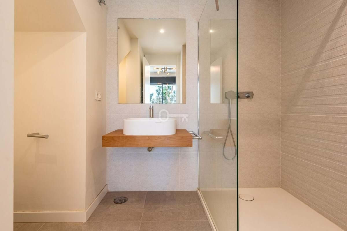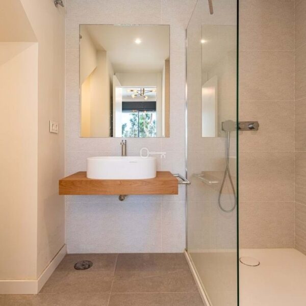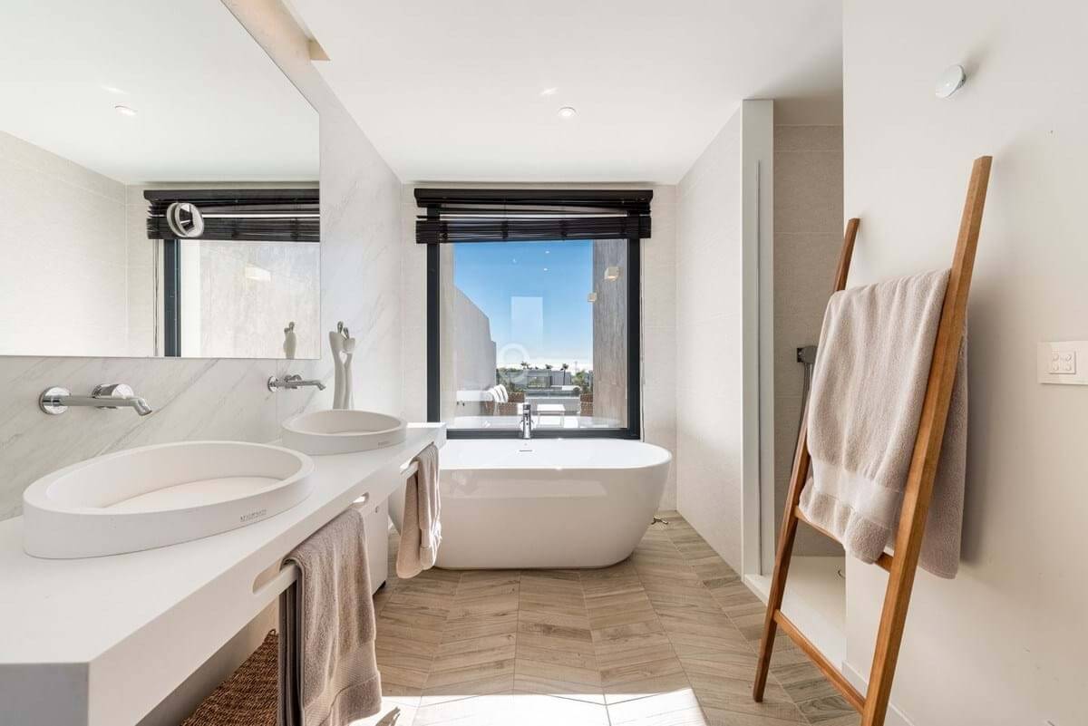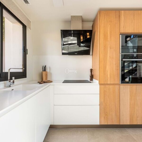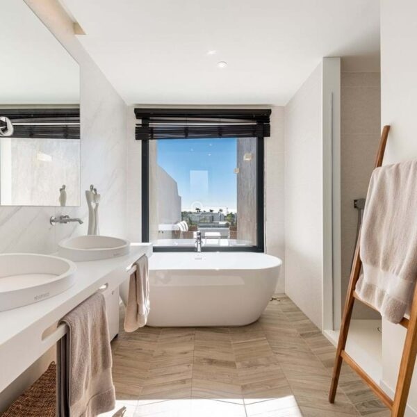 The house offers 3 bedrooms, all with en-suite bathrooms, a guest toilet, and a practical storage/laundry room. The open-plan living room and kitchen lead directly out to a wonderful terrace, while the large floor-to-ceiling windows fill the home with natural light and create a sense of space and luxury.