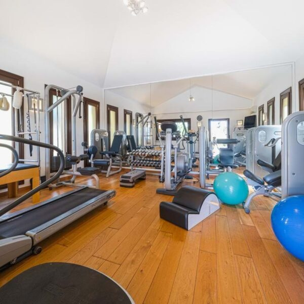 Na piętrze: 3 przestronne sypialnie z dostępem do tarasów, biblioteka / gabinet z kominkiem i łazienka z prysznicem. Obok basenu znajduje się dobudowany pawilon z siłownią, sauną, łazienką i dodatkowymi schowkami.