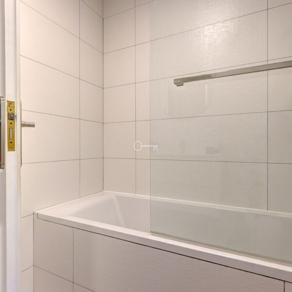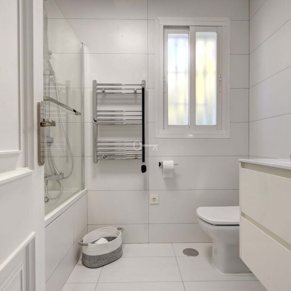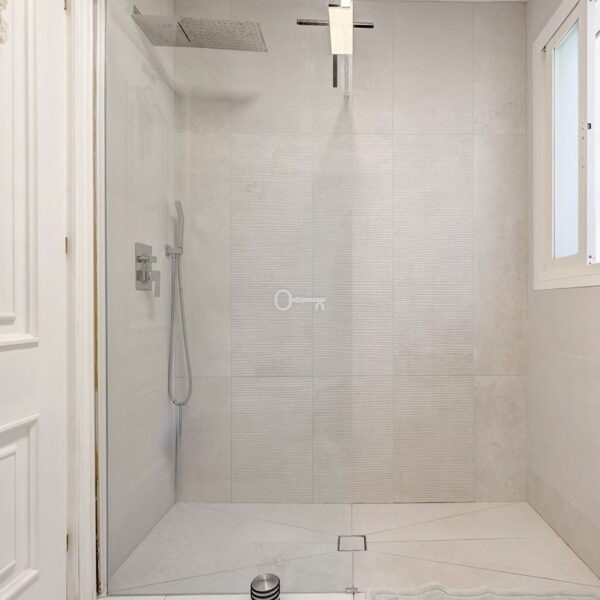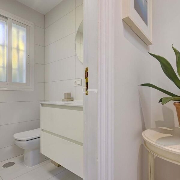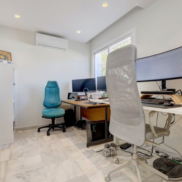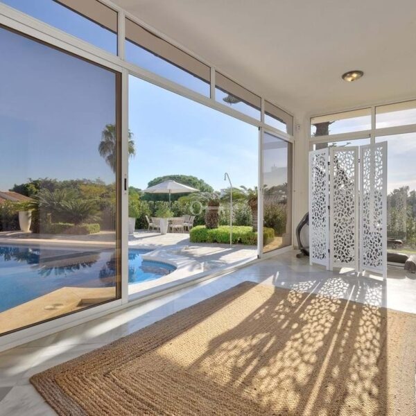 Po lewej stronie wchodzi się do dużego otwartego salonu, który jest pełen naturalnego światła i otwiera się bezpośrednio na duży taras, który następnie prowadzi do basenu, patio i ogrodu. Basen o wymiarach 11 m x 5 m jest naprawdę bardzo duży. Obecnie taras jest zamknięty drzwiami patio, ale można go ponownie otworzyć, jeśli nowy nabywca sobie tego życzy. Kuchnia jest częściowo otwarta na salon. Została zreformowana i wychodzi na taras i basen, co jest bardzo wygodne w przypadku cateringu / jadalni na zewnątrz.