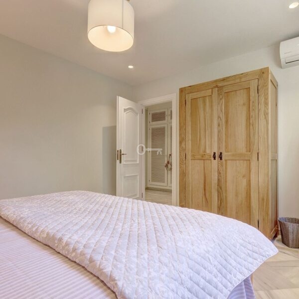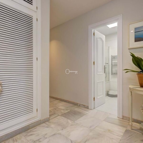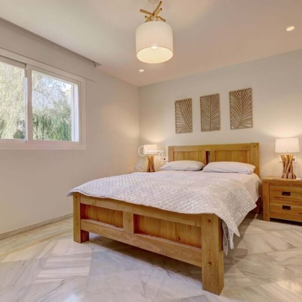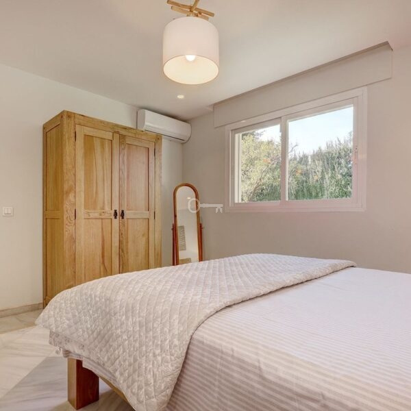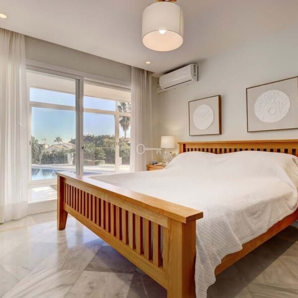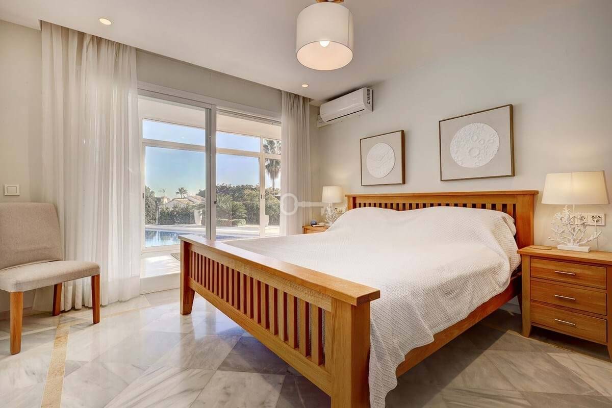 Główna sypialnia jest w pełni wyposażona w łazienkę, a także ma pełną garderobę, która sama w sobie jest wielkości sypialni. Ten apartament ma drzwi patio prowadzące na taras i basen.