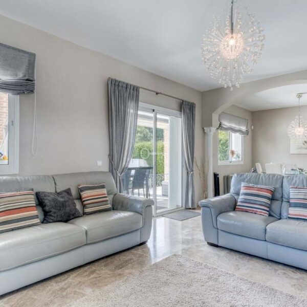 Outside, mature landscaped gardens surround the villa, creating privacy and a peaceful setting. The swimming pool sits beside generous terraces and a covered seating area, ideal for outdoor dining and entertaining.