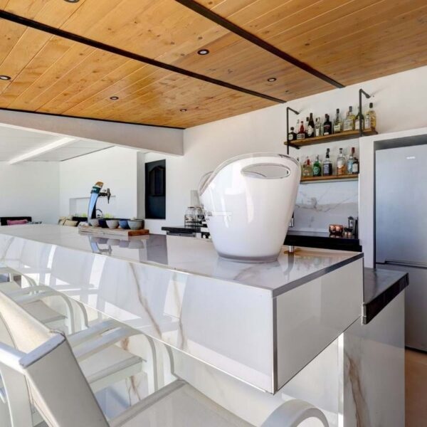 Po wejściu przez hol wejściowy centralne schody prowadzą na główny poziom mieszkalny. Tutaj czeka oszałamiająca kuchnia na otwartym planie, w pełni wyposażona w wysokiej klasy sprzęt AGD, szafki na zamówienie i centralną wyspę idealną zarówno do rozrywki, jak i codziennego życia. Duże składane drzwi otwierają się bezpośrednio na taras i ogrody, tworząc płynny przepływ wewnątrz i na zewnątrz.