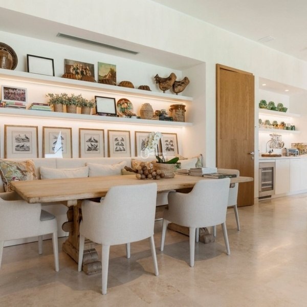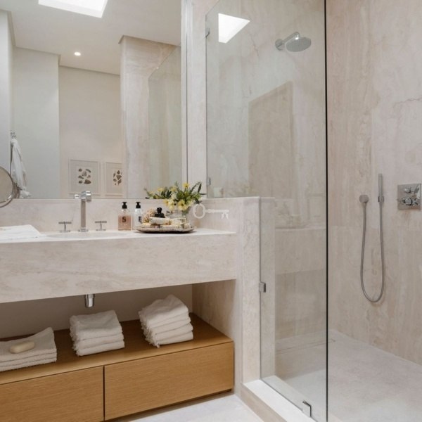 Na parterze znajduje się salon i jadalnia na otwartym planie z wysokimi sufitami i dużymi oknami, w pełni wyposażona nowoczesna kuchnia oraz dwie sypialnie z łazienkami i bezpośrednim dostępem do ogrodu. Górny poziom oferuje trzy sypialnie z łazienkami.