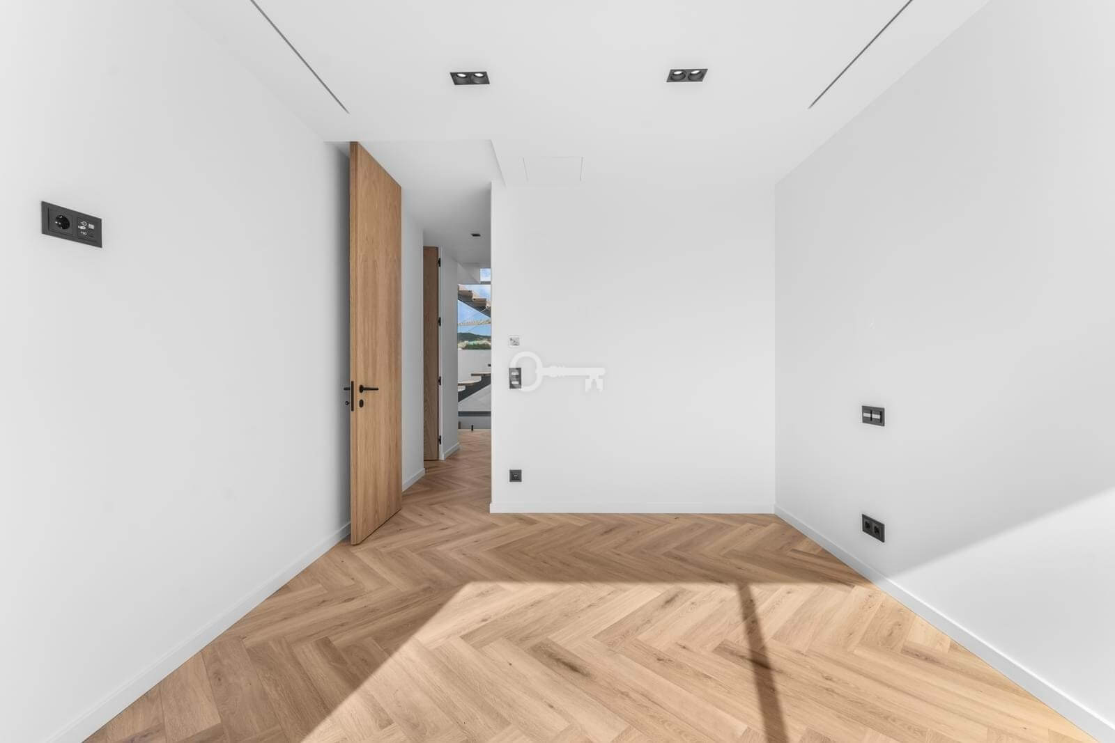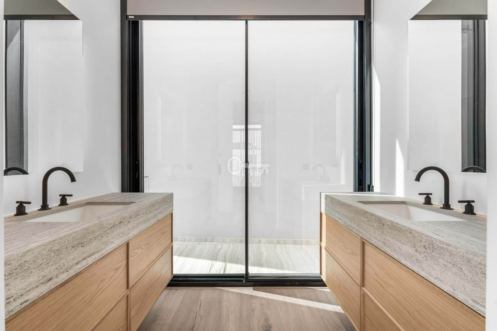 The upper floor comprises two master suites with walk-in closets, complemented by two additional suites, all opening onto private balconies that elevate the sense of space and light.