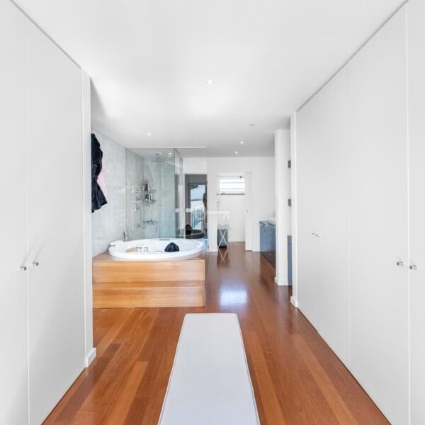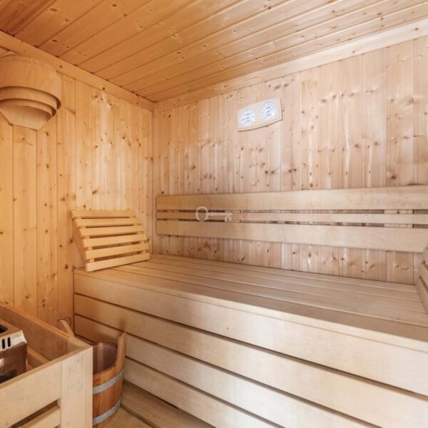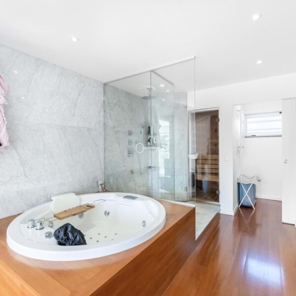 – Exclusive master suite with excellent natural light, featuring a walk-in closet, bathroom with bathtub and shower, and sauna