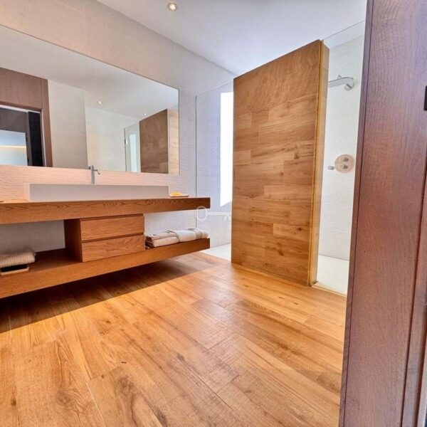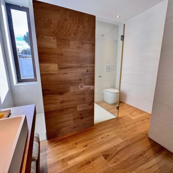 On the main floor, you will find an elegant living room with fireplace, filled with natural light and connected to the outdoor area, a fully equipped modern kitchen, a guest toilet, a laundry area, and the master bedroom with an en-suite bathroom. From this floor there is direct access to the outdoor area where you will find the private swimming pool, perfect for enjoying the Mediterranean climate.