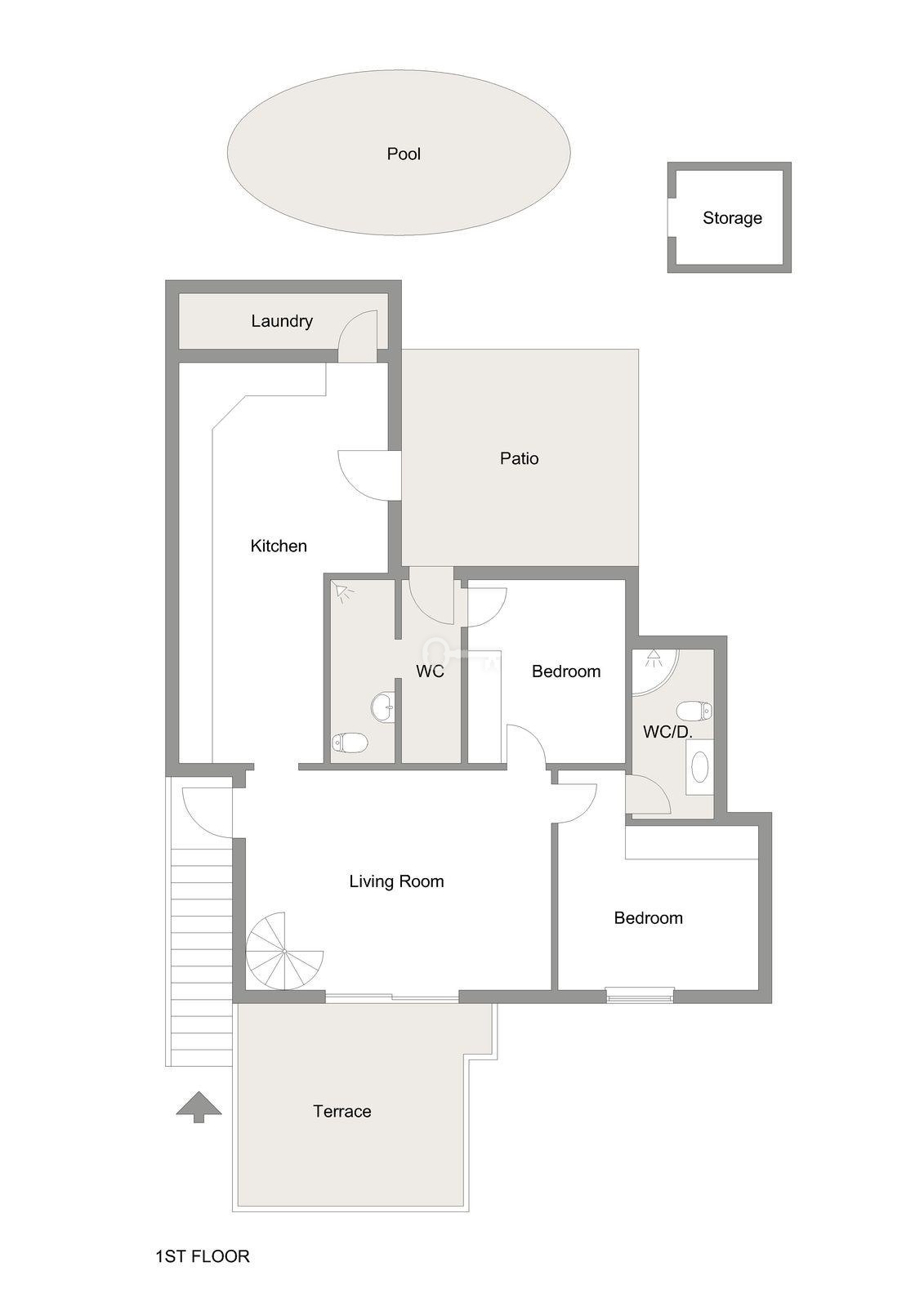 Schodząc w dół spiralnymi schodami, można dotrzeć do niezależnej dużej sypialni z garderobą i dużą łazienką. Ta prywatna sypialnia ma bezpośredni dostęp do zewnętrznej części ogrodu, wszechstronnej przestrzeni z dużym potencjałem do kształtowania krajobrazu, tworzenia placu zabaw lub ustawiania grilla i jadalni. Z tyłu willi znajduje się prywatny basen, idealny do ochłody w gorące letnie dni i organizowania przyjęć przy basenie z przyjaciółmi i rodziną.