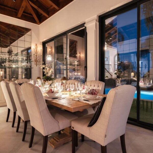 Traditional architecture paired with spacious, open-plan interiors, with warm materials, high ceilings, and graceful arches create a timeless and welcoming ambiance.