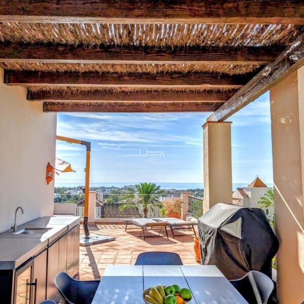 Górne piętro składa się z dodatkowej sypialni lub biura / studia z łazienką i dostępem do wspaniałego tarasu na dachu, idealnego na spotkania na świeżym powietrzu z rodziną i przyjaciółmi. Taras cieszy się słońcem przez cały dzień, niesamowitymi panoramicznymi widokami na Morze Śródziemne i jest wyposażony w grill, letnią kuchnię i chłodziarkę do wina, wygodną część wypoczynkową i miejsce do opalania.