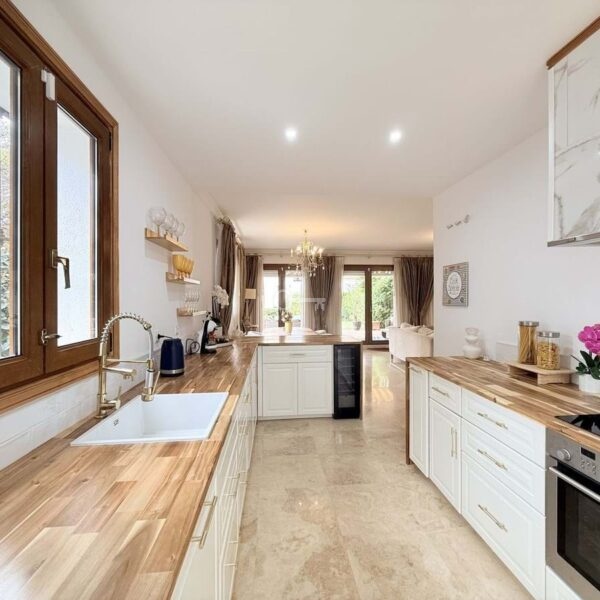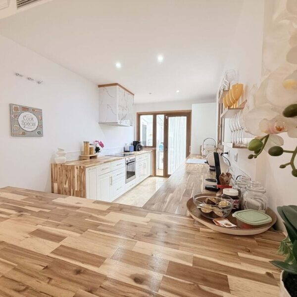 The ground floor features an inviting entrance hallway leading into a large open-plan kitchen, dining and living area, complete with an open fireplace. Three impressive patio doors open directly onto the private terrace and garden, creating a seamless flow for outdoor dining and entertaining. As a corner unit, the property enjoys added privacy and a more open feel.