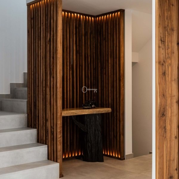 Charakterystyczne drewniane akcenty, wykonane ręcznie przez mistrzowskiego lokalnego rzemieślnika, nadają odrobinę kunsztu na zamówienie w całym domu. Willa posiada również ogrzewanie podłogowe, zapewniające komfort przez cały rok.