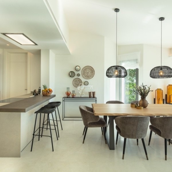 Rezydencja składa się z trzech dobrze wyposażonych sypialni, w tym głównego apartamentu z łazienką, dwóch dodatkowych łazienek i toalety dla gości. Wnętrze jest w pełni umeblowane i klimatyzowane, zapewniając komfort przez cały rok. Przestrzenie mieszkalne obejmują przestronny salon i dedykowaną jadalnię, zaprojektowane tak, aby zmaksymalizować naturalne światło i zapewnić płynny dostęp do zewnętrznych tarasów. Wyposażone szafy zapewniają dużo miejsca do przechowywania, a w pełni wyposażona kuchnia jest w stanie zaspokoić wszystkie kulinarne potrzeby.