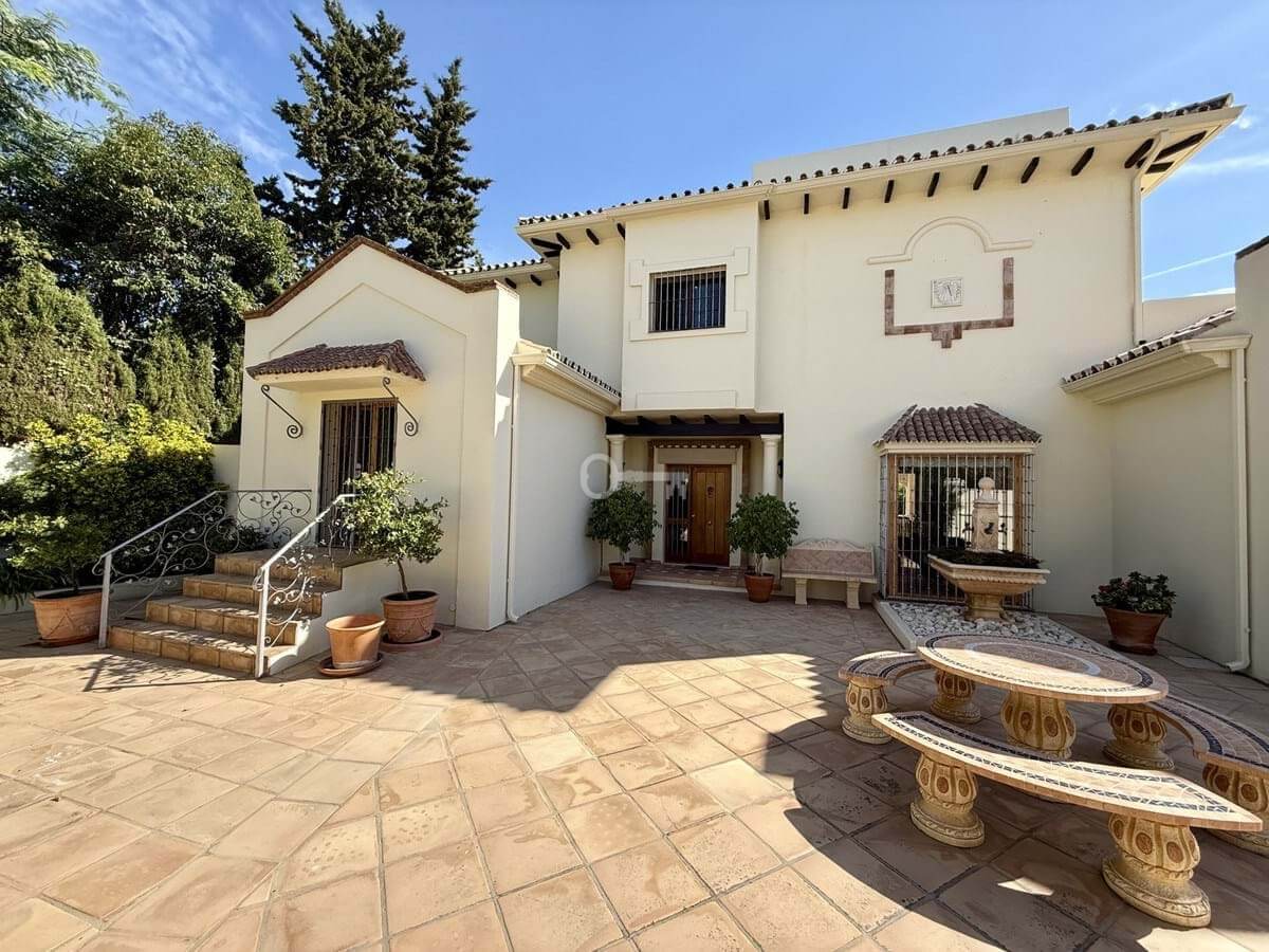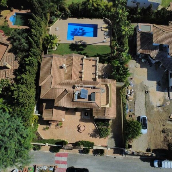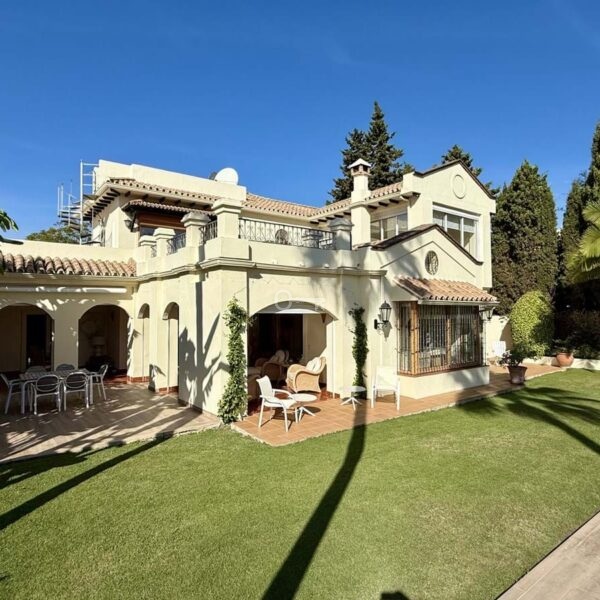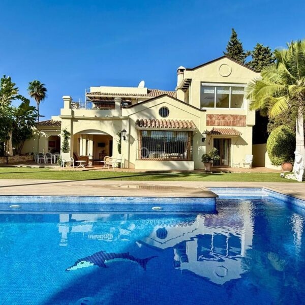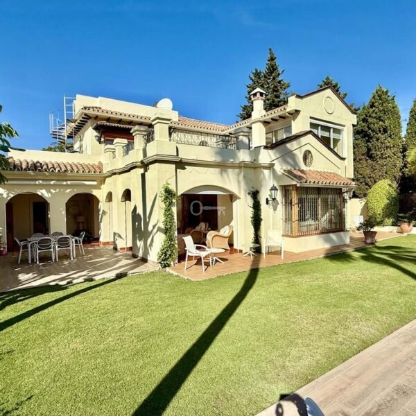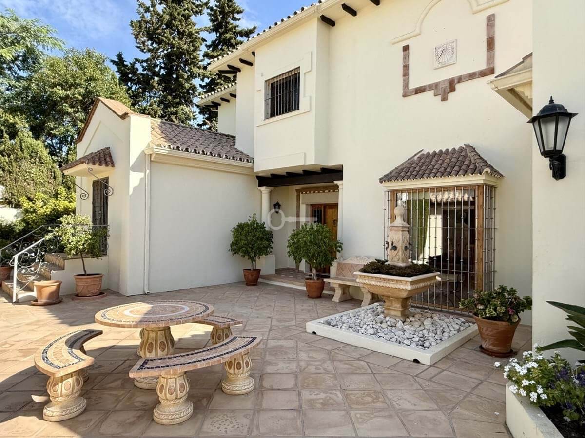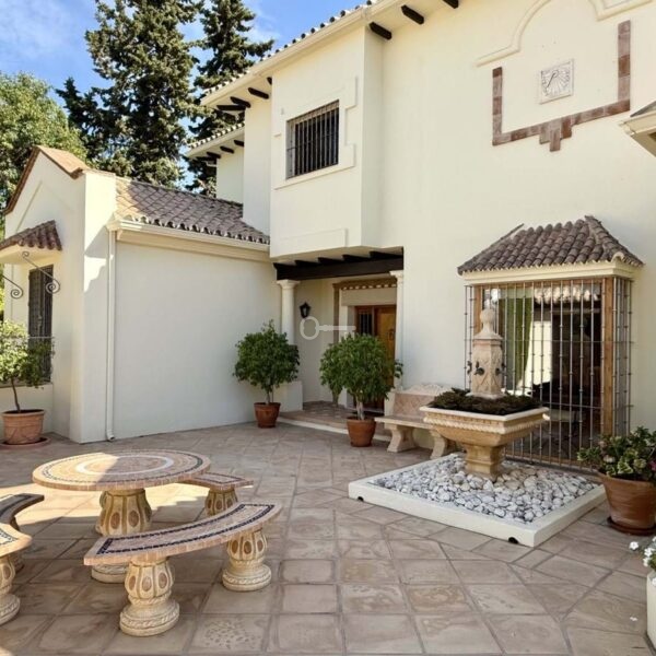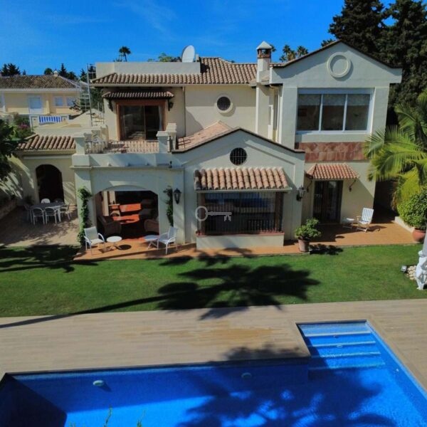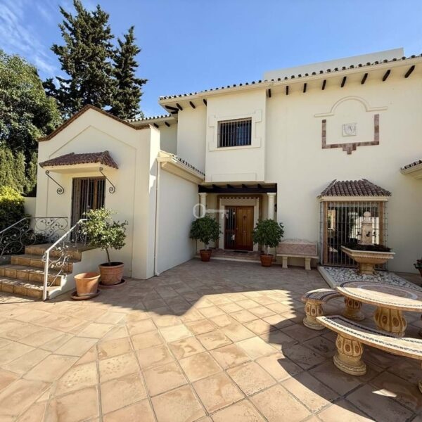 This great property has just come to the market at a very competitive price. It’s an Ideal location, walking distance to several commercial centers make it very desirable for those who don’t want to take the car to enjoy facilities and restaurants, supermarket, pharmacy, gym or a nice coffee shop. The property is in a lovely condition. The villa has a nice elegant andalusian style. The entrance hall connect to the right with the separate dining room, the fully fitted kitchen ad the large covered and uncovered terrace to the landscaped mature and very private garden and pool. The spacious living room has a high ceiling with wooden beams. On the same level we find two bedrooms with en suite bathroom. A nice stair case bring us up tot he first floor where we find a large and very bright bedroom and the master bedroom with , ensuite bathroom and access to a large very sunny uncovered terrace with lovely mountain views. Going down to the basement we find a games room, a hobby room with bathroom and the very large garage for several cars. Also the utility room. This great family property enjoys a fantastic mature garden and a lovely entrance area. International schools like Atalaya, San José in Guadalmina are just nearby. Proximity to all facilities as several golf courses like El Paraiso, Atalaya or los Flamingos, the beach at 15 minutes walk, The lovely El Campanario sport club with fantastic indoor pool, gym, spa and much more make this a unique family home. A visit is highly recommended.