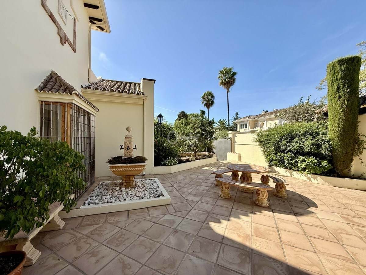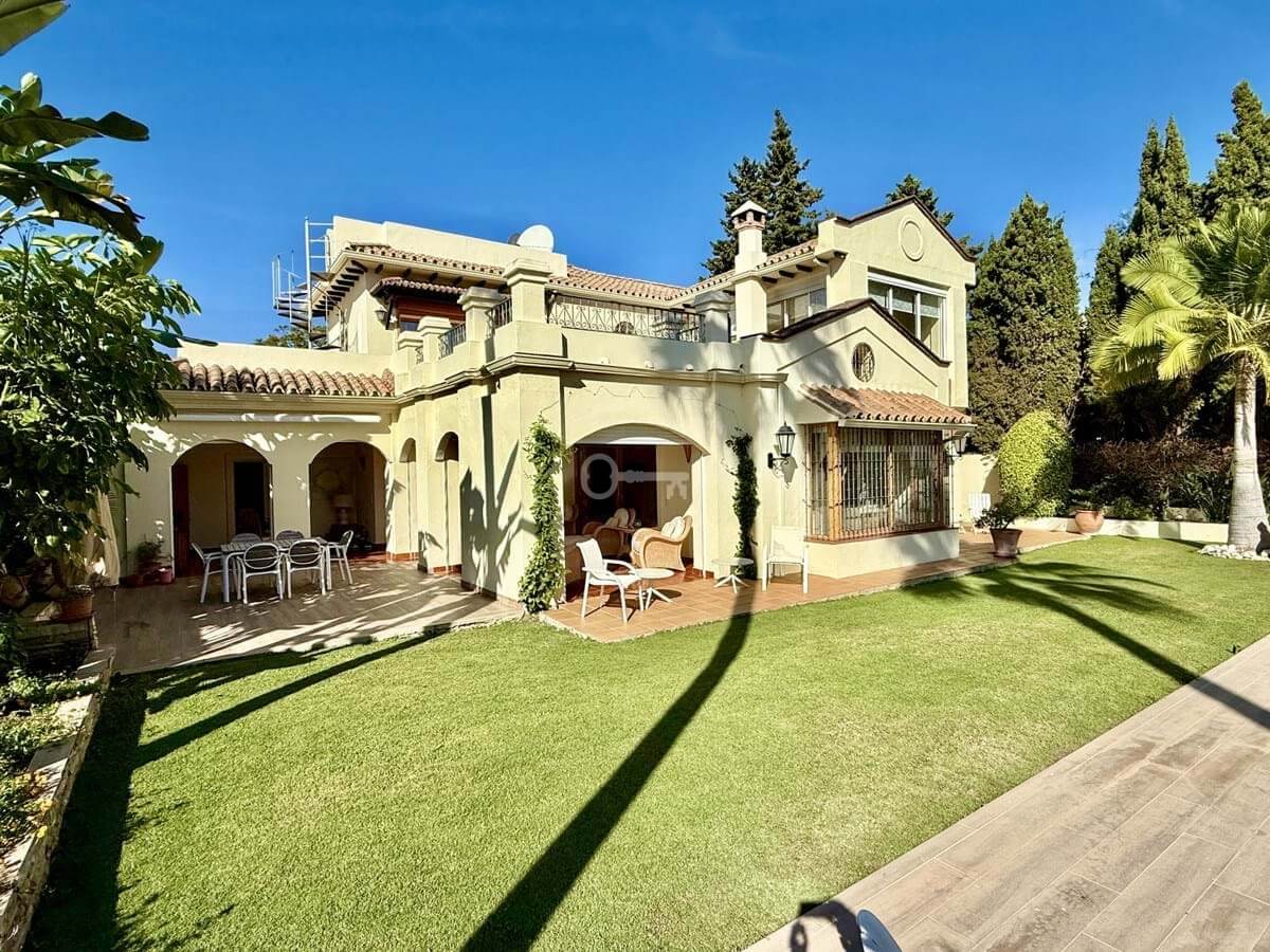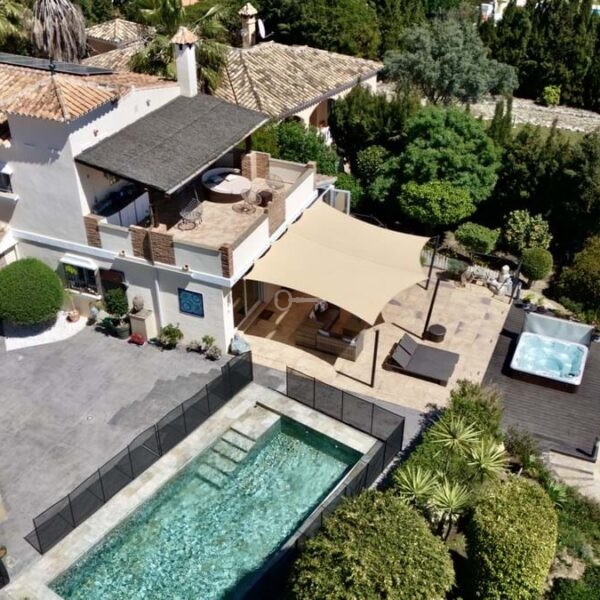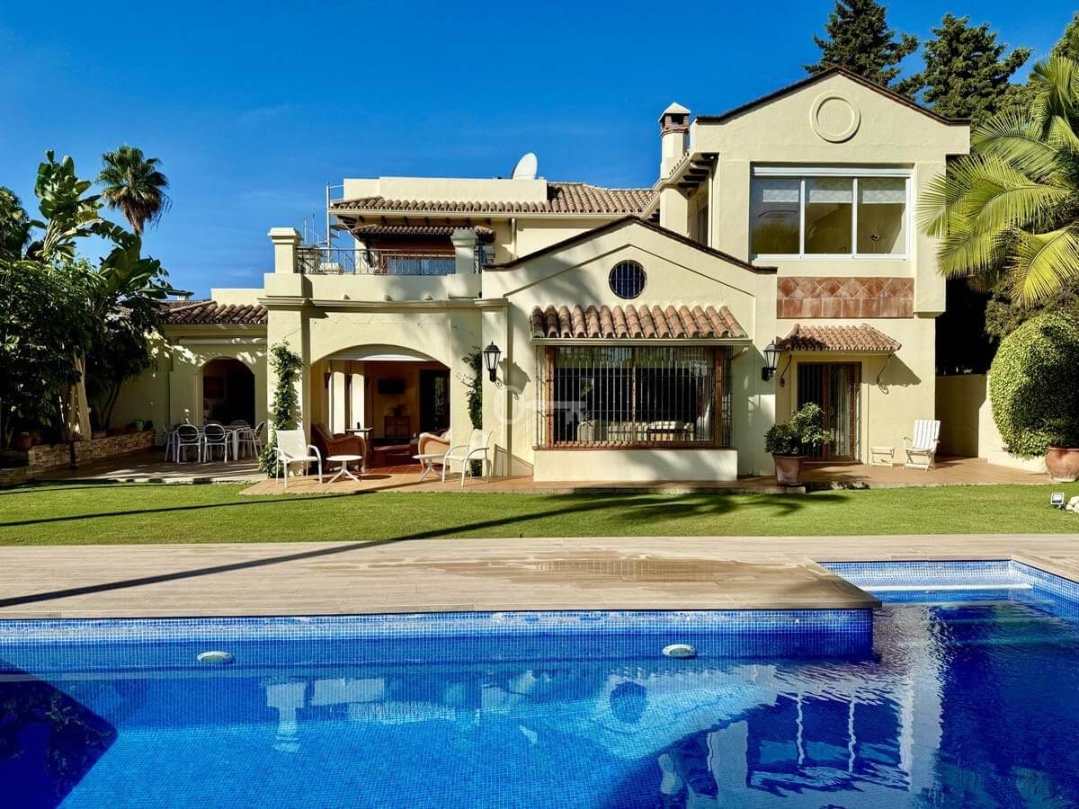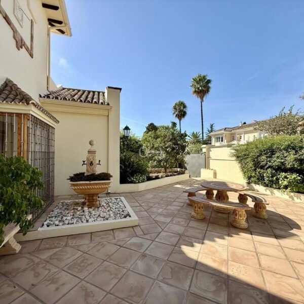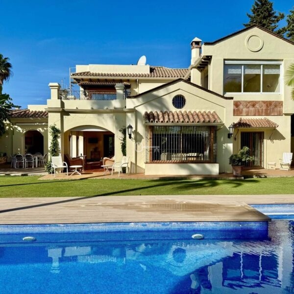 This great property has just come to the market at a very competitive price. It’s an Ideal location, walking distance to several commercial centers make it very desirable for those who don’t want to take the car to enjoy facilities and restaurants, supermarket, pharmacy, gym or a nice coffee shop. The property is in a lovely condition. The villa has a nice elegant andalusian style. The entrance hall connect to the right with the separate dining room, the fully fitted kitchen ad the large covered and uncovered terrace to the landscaped mature and very private garden and pool. The spacious living room has a high ceiling with wooden beams. On the same level we find two bedrooms with en suite bathroom. A nice stair case bring us up tot he first floor where we find a large and very bright bedroom and the master bedroom with , ensuite bathroom and access to a large very sunny uncovered terrace with lovely mountain views. Going down to the basement we find a games room, a hobby room with bathroom and the very large garage for several cars. Also the utility room. This great family property enjoys a fantastic mature garden and a lovely entrance area. International schools like Atalaya, San José in Guadalmina are just nearby. Proximity to all facilities as several golf courses like El Paraiso, Atalaya or los Flamingos, the beach at 15 minutes walk, The lovely El Campanario sport club with fantastic indoor pool, gym, spa and much more make this a unique family home. A visit is highly recommended.