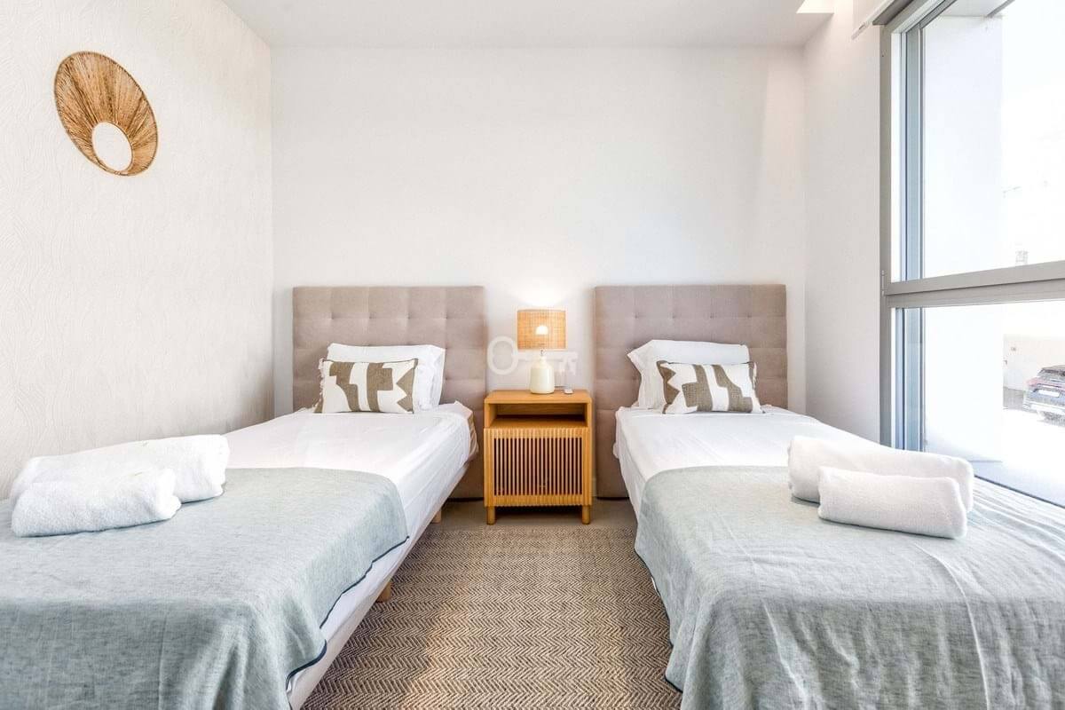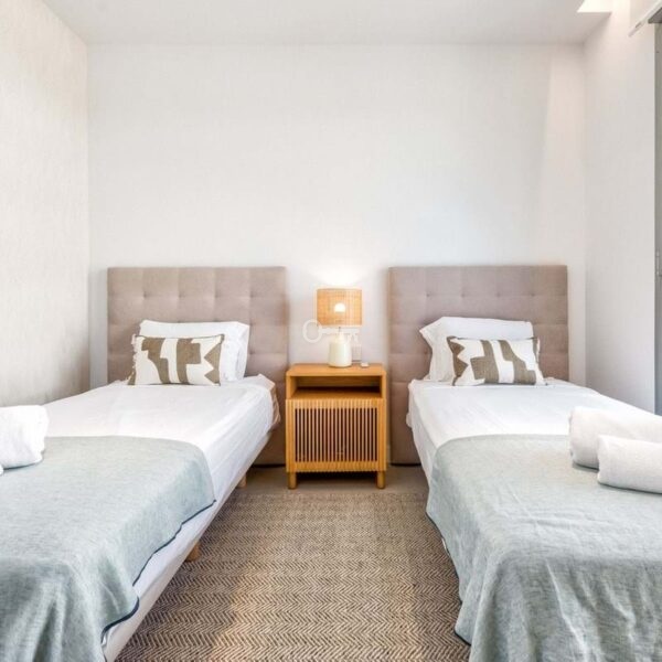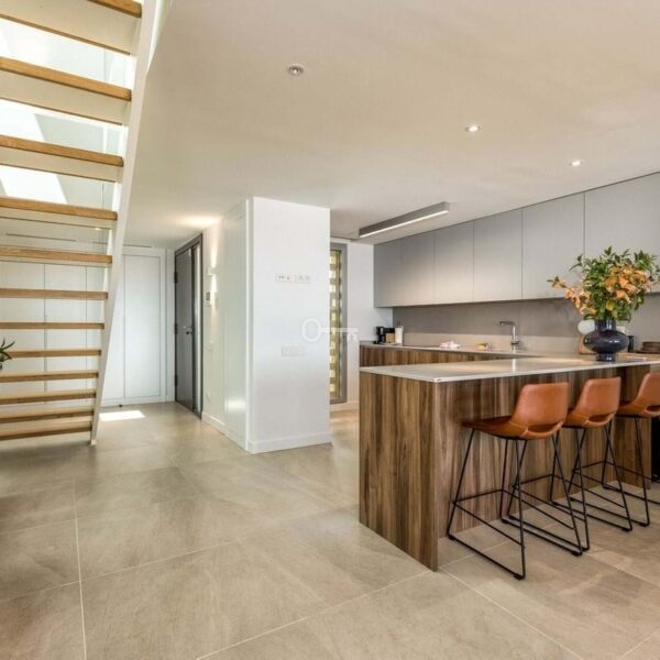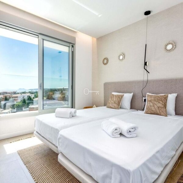 Inside, the home offers a bright open plan living and dining space connected to a fully equipped kitchen. Large windows maximise natural light and frame the sea views from the main living areas and terraces.