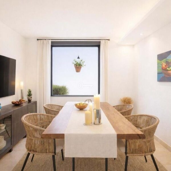Upon entering, you are welcomed into a bright and spacious open-plan living area, where a fully equipped designer kitchen and dining space flow effortlessly into a serene private Andalusian patio. This tranquil outdoor sanctuary creates a seamless indoor-outdoor lifestyleideal for both relaxing and entertaining. The ground floor also features a beautifully appointed bedroom and a stylish bathroom, offering comfort and convenience.